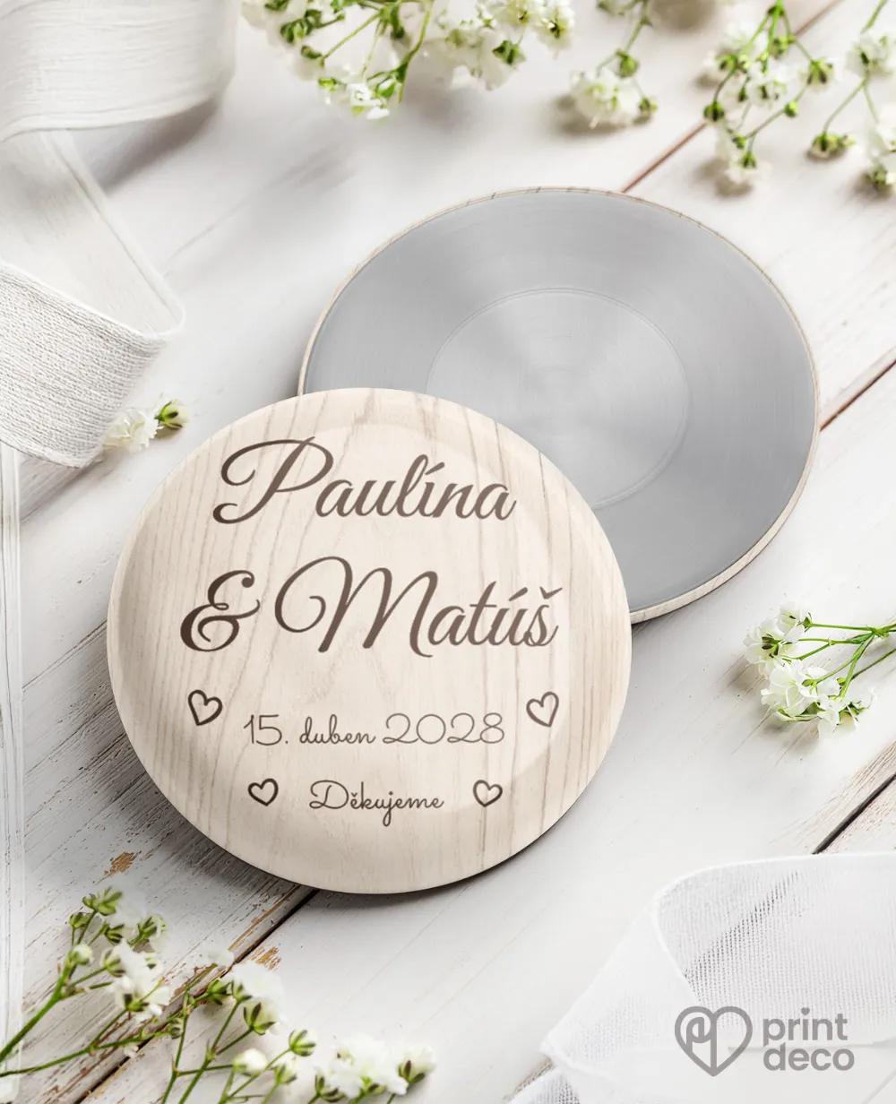 V tomto motivu pro vás můžeme připravit i další svatební tiskoviny ve stejném stylu – etikety na lahve, jmenovky na stůl či památeční magnetky, aby bylo vše dokonale sladěné a harmonické.
