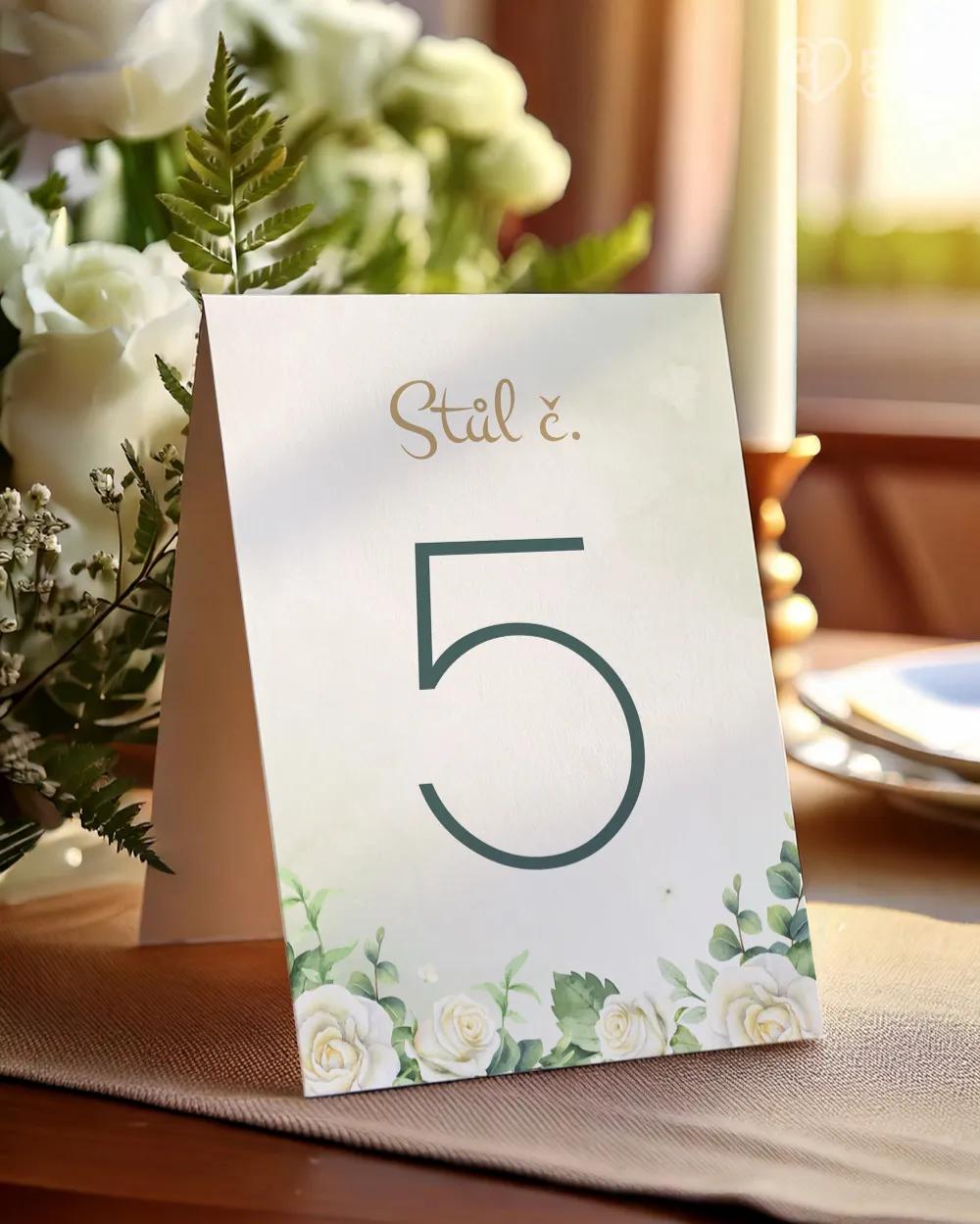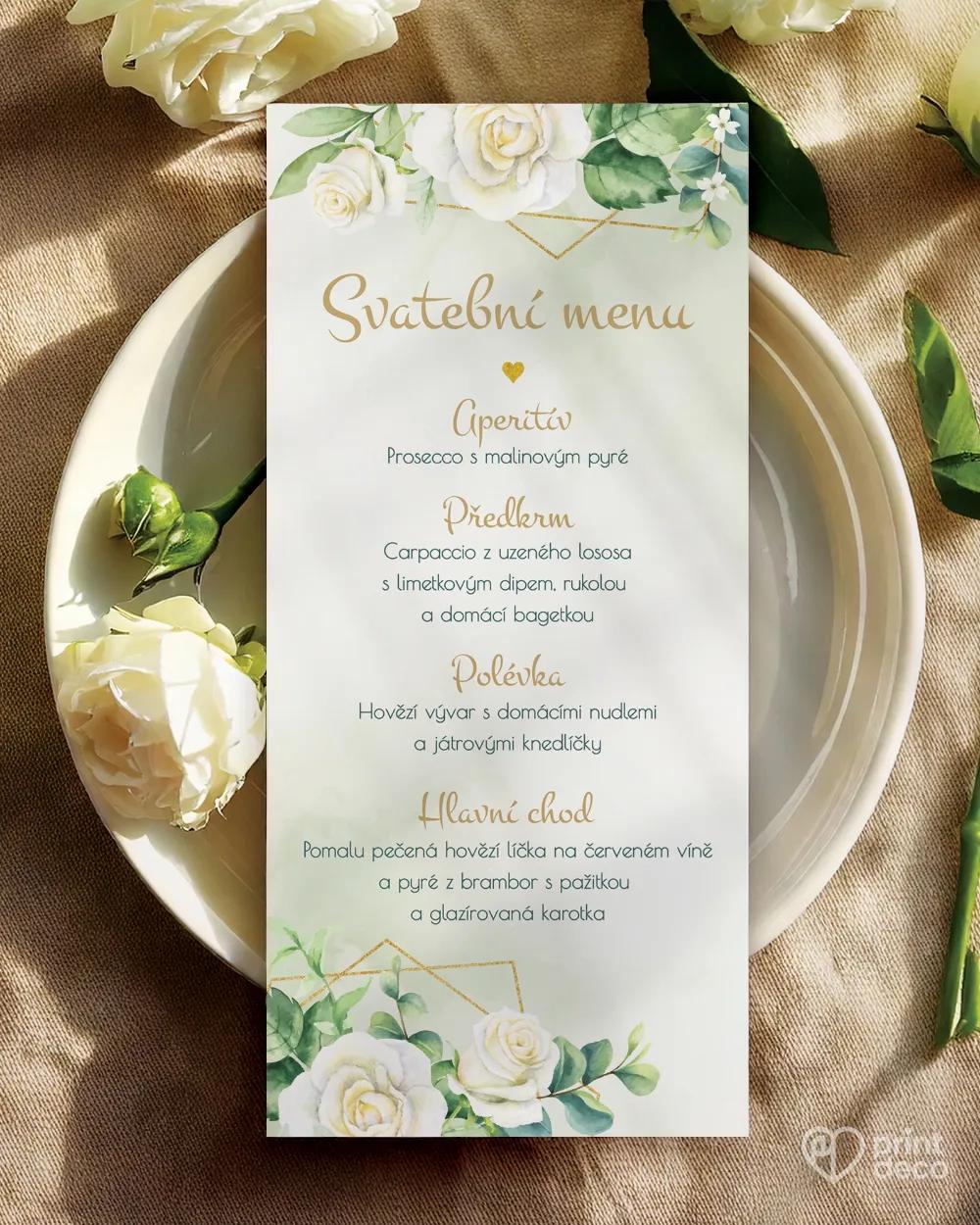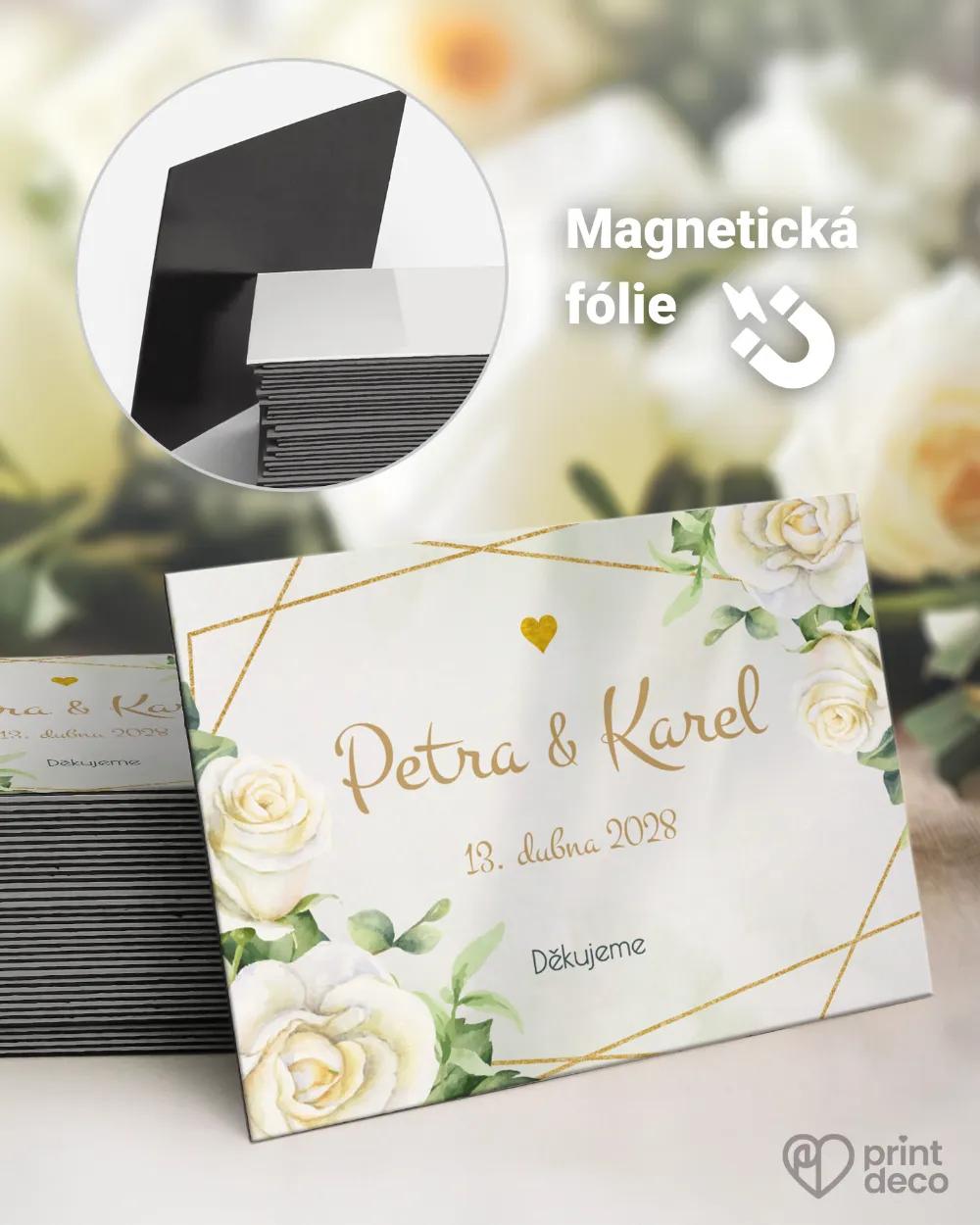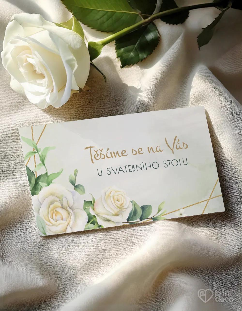 Elegantní svatební oznámení s bílými růžemi a zlatými detaily. Romantická volba pro výjimečný den plný lásky a něhy.