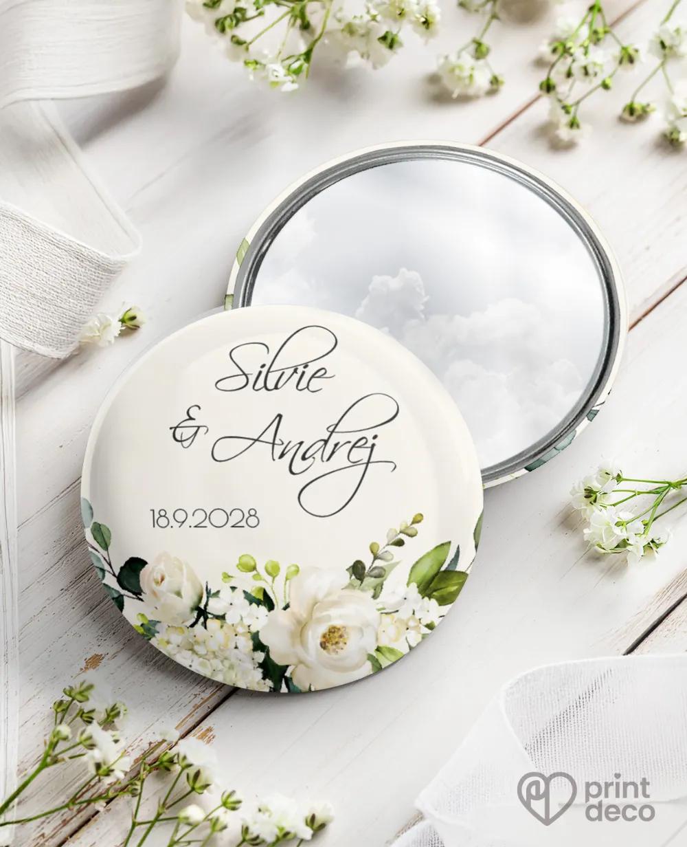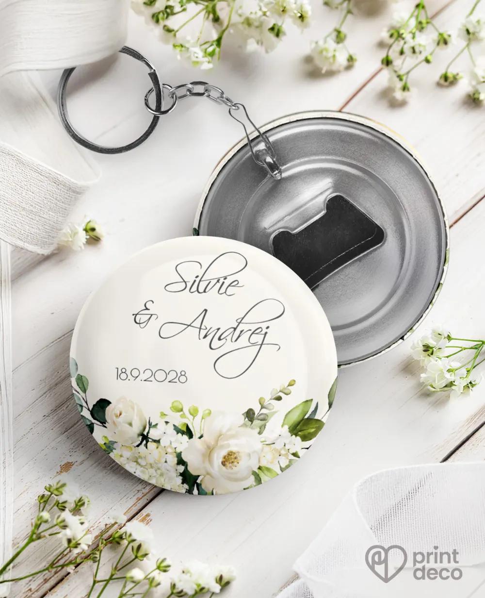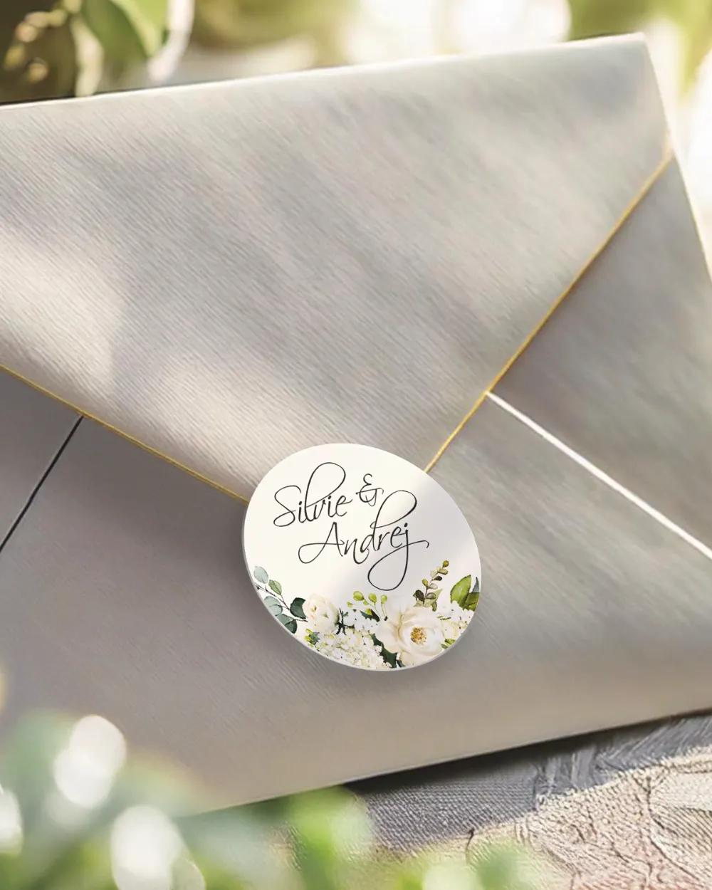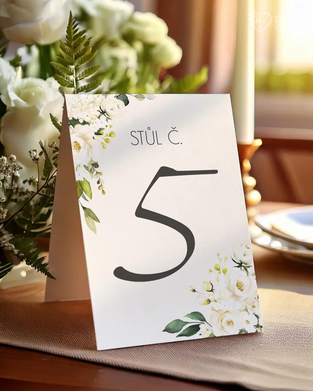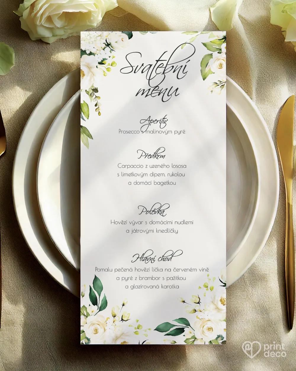 Romantické svatební oznámení s bílými růžemi a zelenými listy, které zdůrazňují lásku ve váš svatební den. Elegantní design.