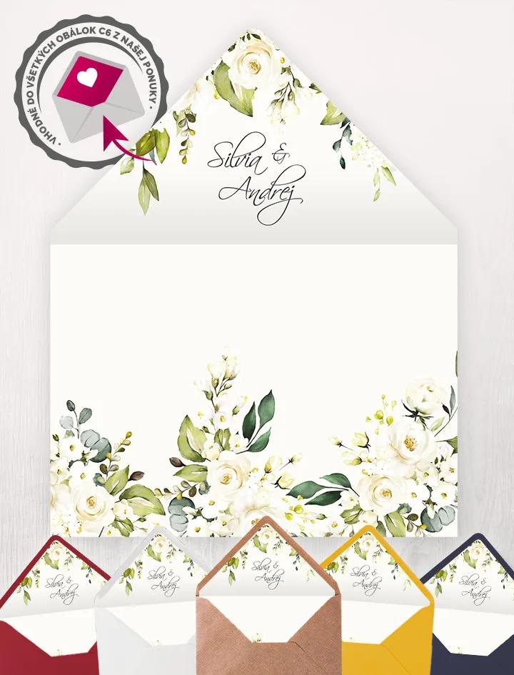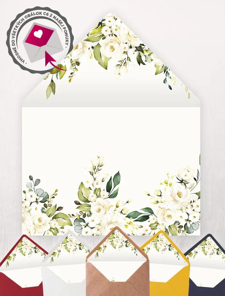 Romanticky laděná svatební oznámení – Bílé růže jsou pozvánkou, která se neodmítá. Po obřadu se proto připravte na dlouhou řadu gratulantů, kteří s vámi budou sdílet radost z vašeho velkého dne. Rozkvetlé růže, zvýrazněné zelení listů, rámují text a soustředí pozornost na to nejdůležitější ve svatební den – vaši lásku. Ve stejném designu si můžete objednat i ostatní svatební tiskoviny.
