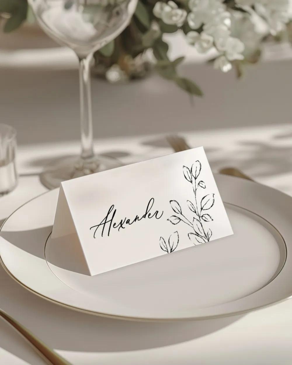 Svatební oznámení s elegantním a nadčasovým vzhledem díky černobílé barevné kombinaci a jemnému motivu větviček. Minimalistická kresba listů dodává oznámení moderní ráz a podtrhuje vytříbenost celkového zpracování. Ručně psané písmo v kombinaci s klasickou typografií vytváří harmonický kontrast, který zaujme na první pohled. Tento styl svatebních oznámení je ideální pro páry, které dávají přednost čistému a elegantnímu řešení bez zbytečných ozdob. Ve stejném vizuálním stylu jsou dostupné i další svatební tiskoviny, jako pozvánky ke stolu, jmenovky, menu, etikety či samolepky.