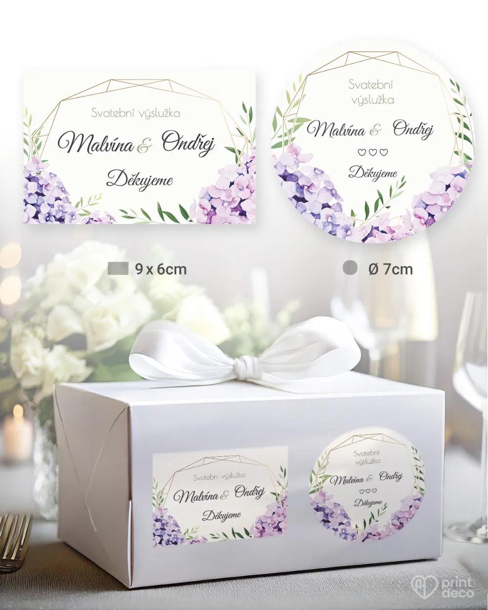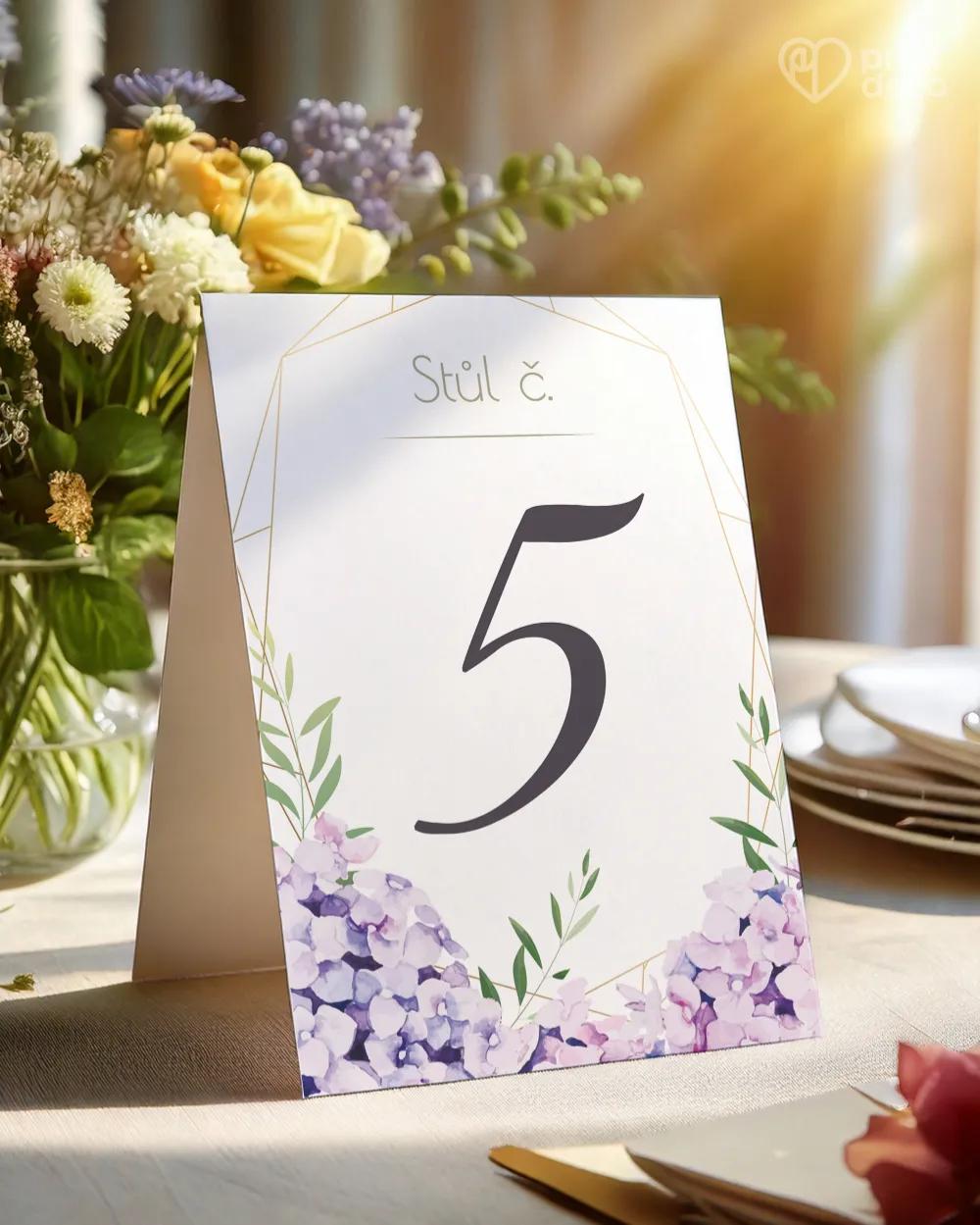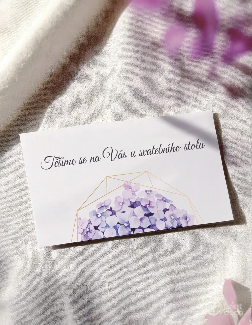 Elegantní svatební oznámení s jemnou hortenzí a geometrickým motivem. Skvělá volba pro svatby v fialových a přírodních tónech.