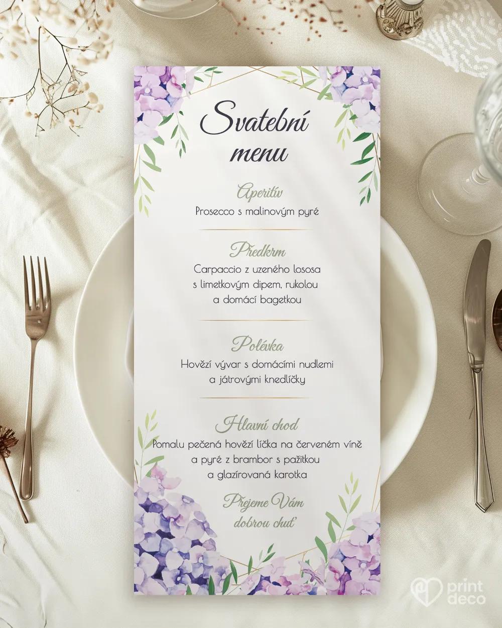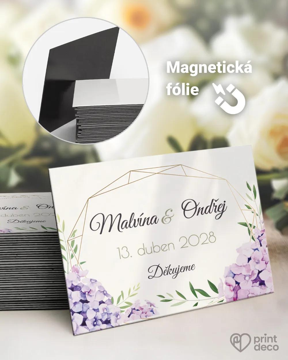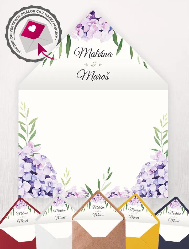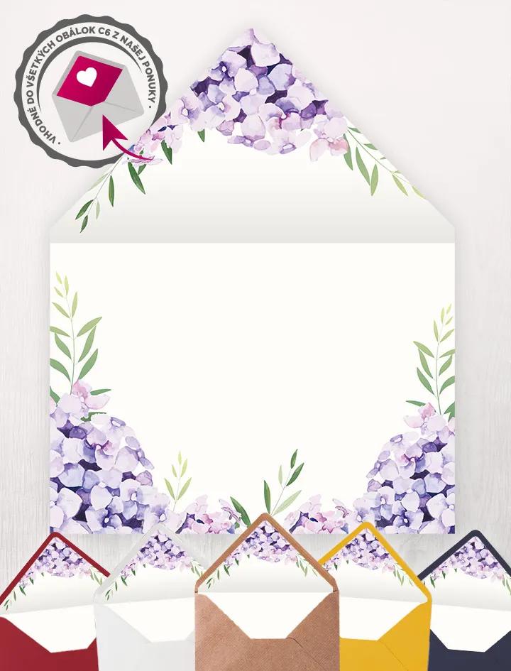 Pro milovníky hortenzií, jemné fialové barvy a jednoduchosti máme svatební oznámení na míru. Na bílém pozadí vyniká oznámení o konání svatby, které je obklopené geometrickými liniemi a celé je dozdobené fialovými květy hortenzií. Stejné květy mohou být součástí výzdoby či například svatební kytice, můžete si také vybrat další tiskoviny ve stejném motivu z naší nabídky a vytvoříte tak dokonalý, oku ladící celek.