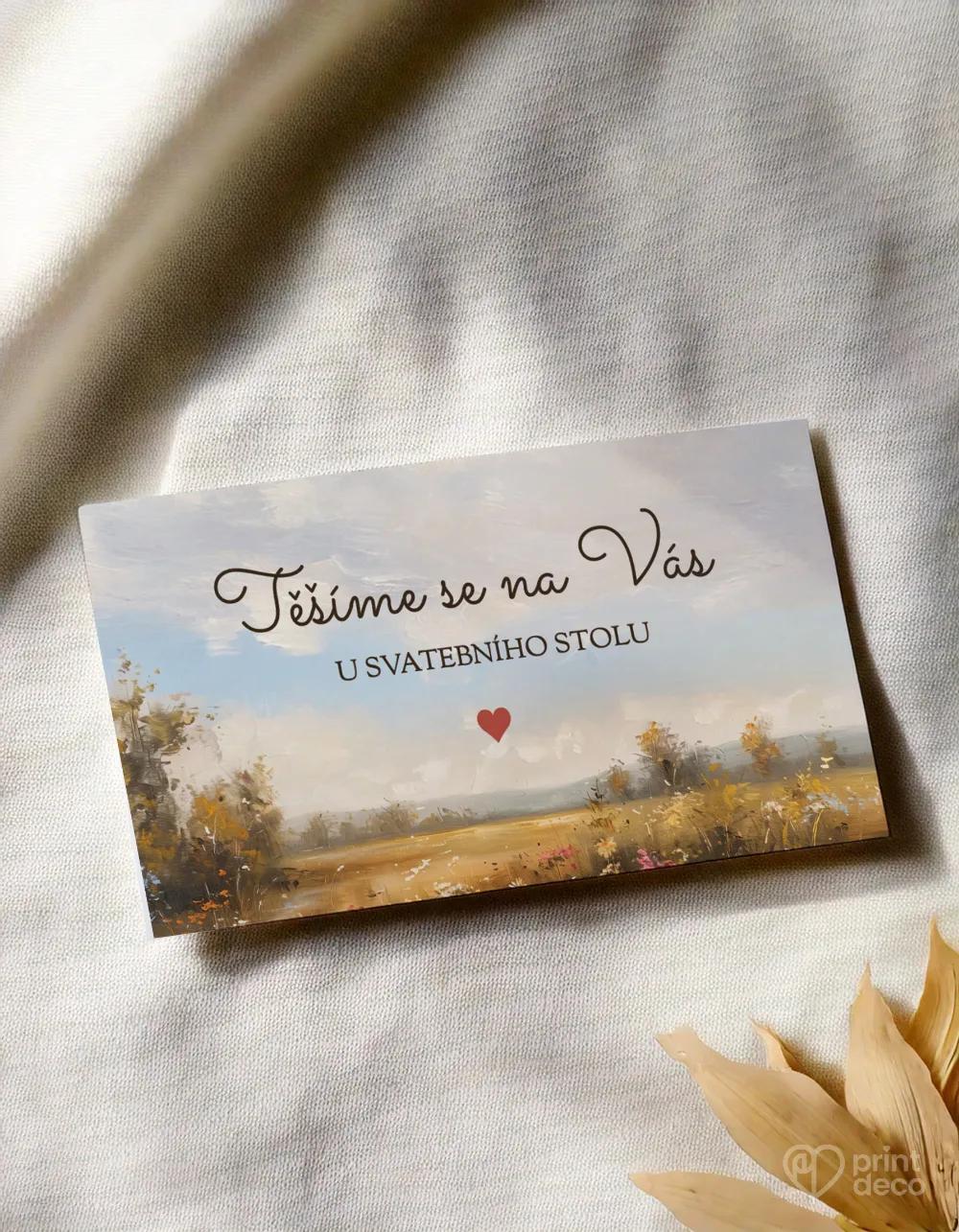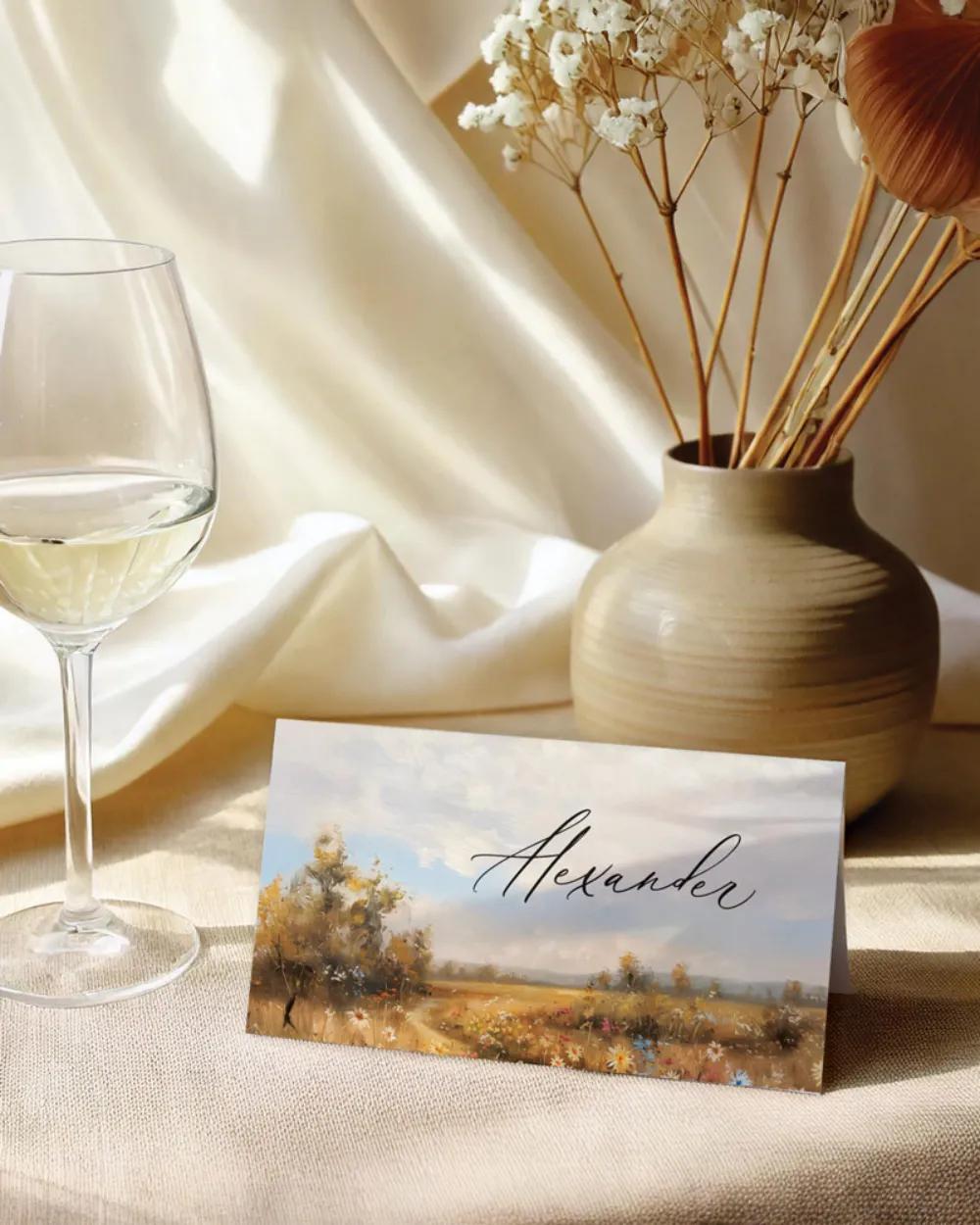 Svatební oznámení s nádherným malovaným motivem letní louky a jemnými pastelovými tóny působí romanticky a umělecky. Elegantní kombinace serifového písma a ručně psaných detailů dodává celkovému pojetí lehký vintage nádech, zatímco teplé barvy evokují harmonii a klid přírody. Ideální volba pro páry, které dávají přednost uměleckým, rustikálním nebo boho svatebním tiskovinám s jedinečnou atmosférou. Ve stejném stylu jsou dostupné také svatební tiskoviny jako jmenovky, menu, etikety, pozvánky ke stolu, samolepky a mnoho dalšího.