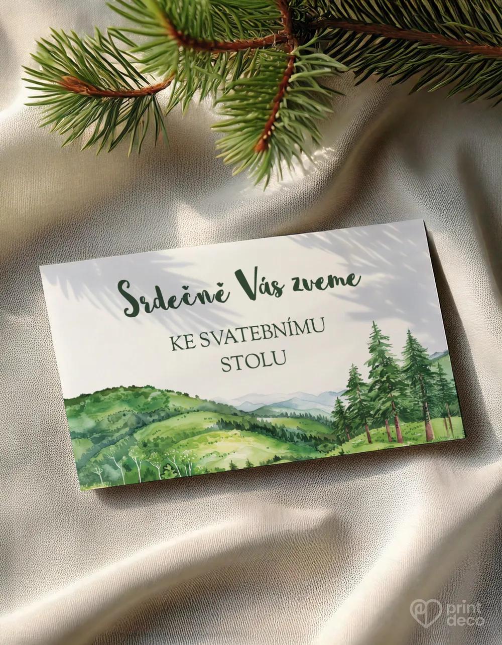 Svatební oznámení s jemnými zelenými tóny a přírodním motivem, ideální pro milovníky přírody a jednoduché elegance.