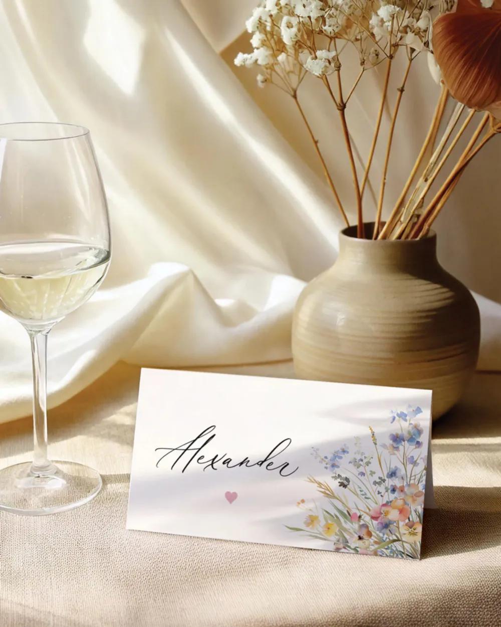 Svatební oznámení s jemným akvarelovým motivem lučních květů v pastelových odstínech vytváří romantickou a něžnou atmosféru. Elegantní kombinace moderního ručně psaného písma a klasické typografie dodává celkovému vzhledu vytříbenost, která je ideální pro svatby v přírodním, boho nebo vintage stylu. Jemné detaily v podobě srdíčka a decentního barevného přechodu podtrhují harmonický a vkusný výraz oznámení. Ve stejném stylu jsou dostupné také svatební tiskoviny jako jmenovky, menu, etikety, pozvánky ke stolu, samolepky a mnoho dalšího.