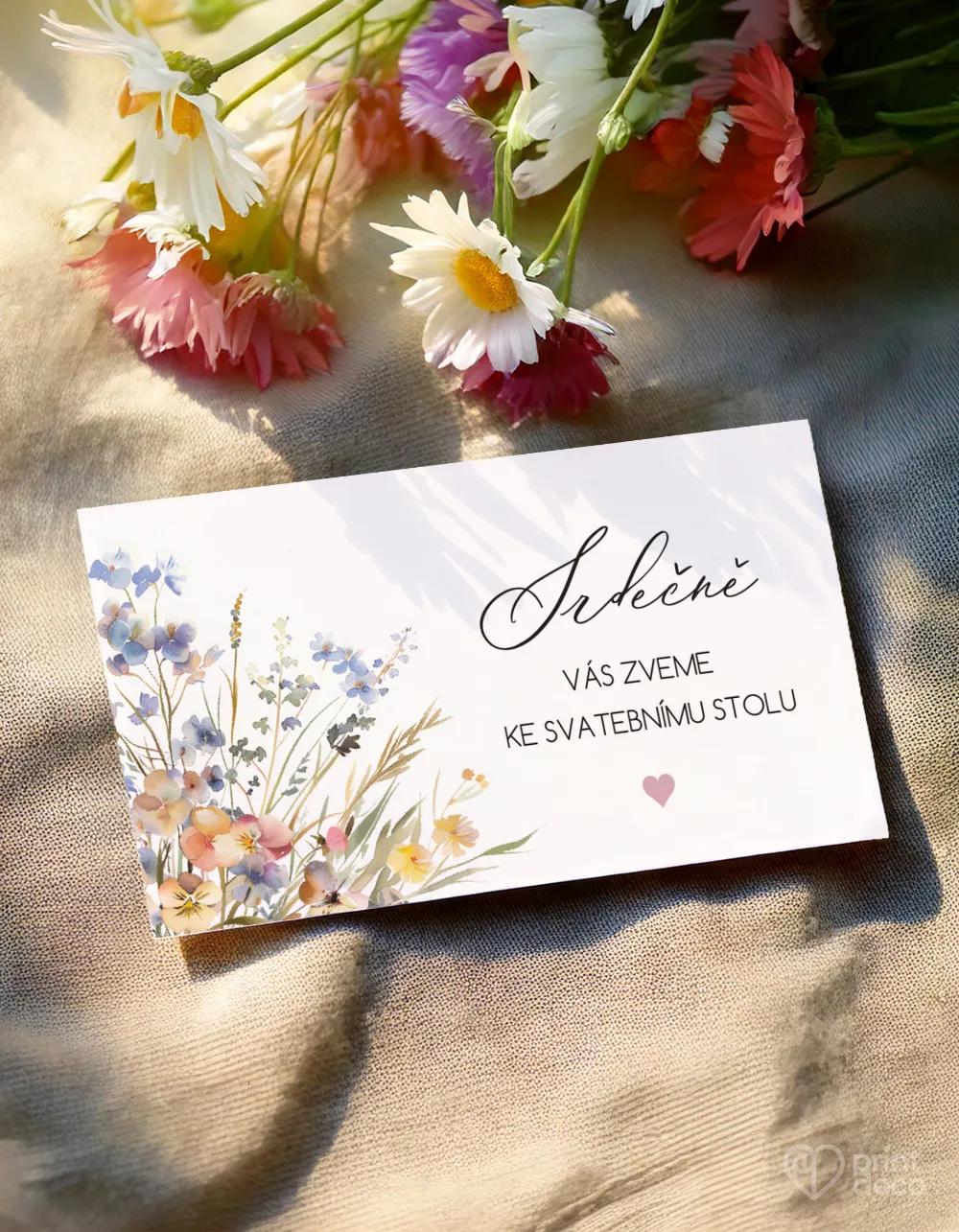 Svatební oznámení Louční láska s jemným akvarelovým motivem loučních květin v pastelových tónech. Elegantní design pro přírodní, boho a vintage svatby.