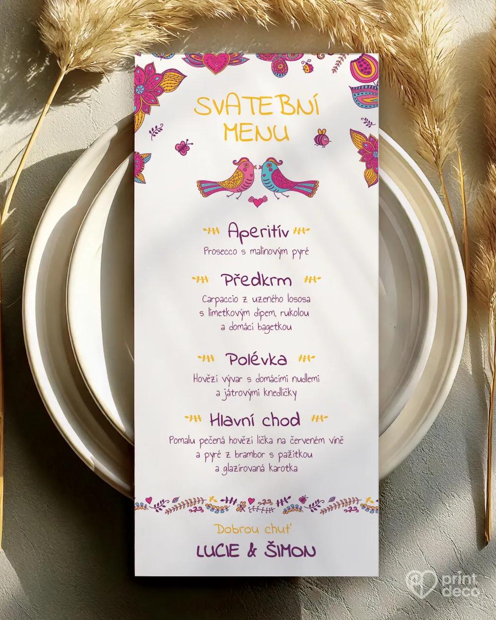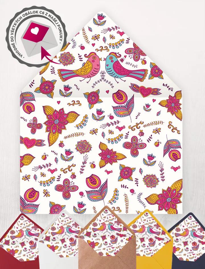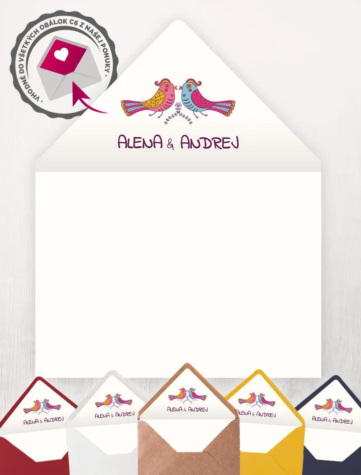 Veselé svatební oznámení s pestrobarevnými ptáčky. Ideální pro hravé páry, které chtějí svatbu plnou barev a originality.