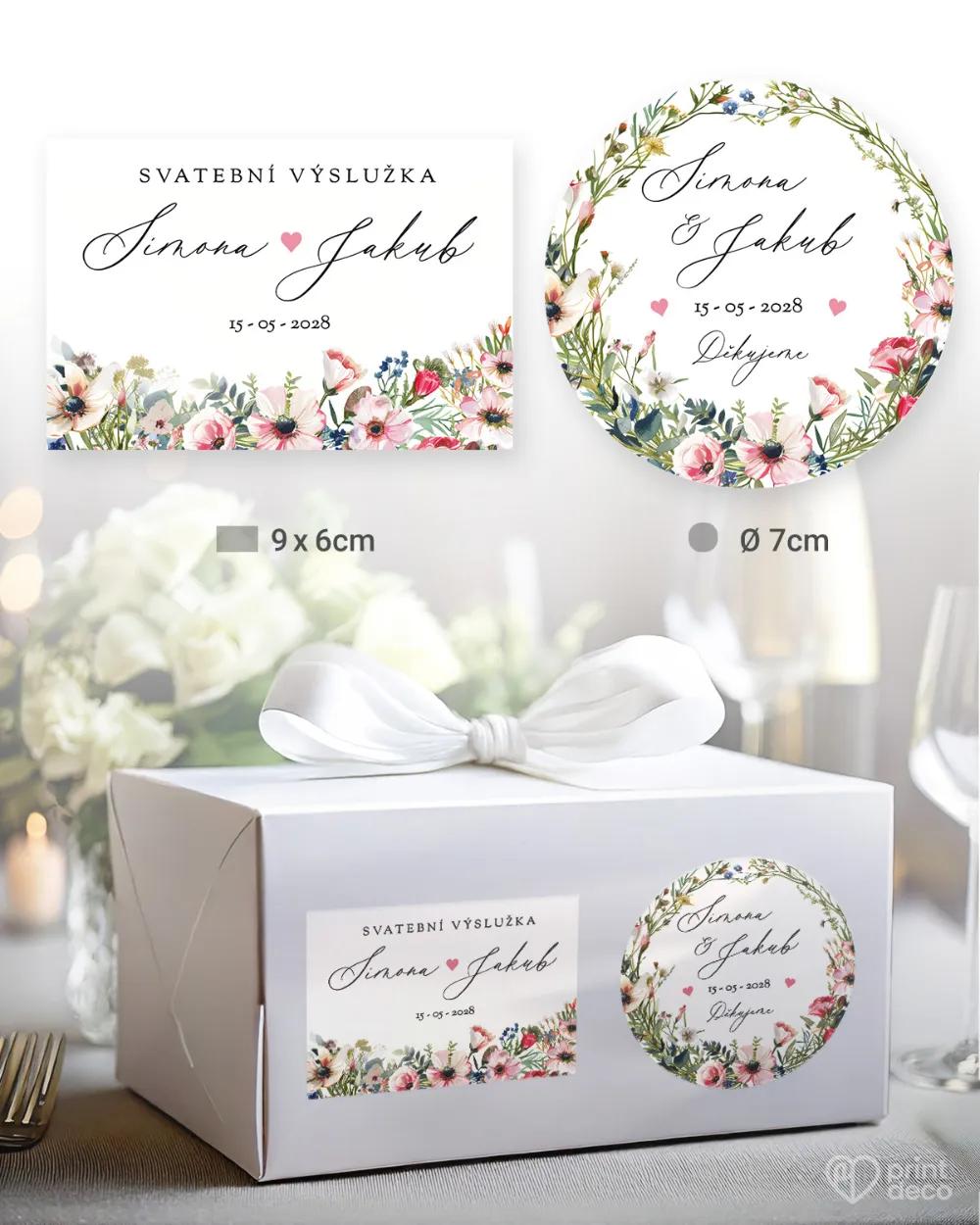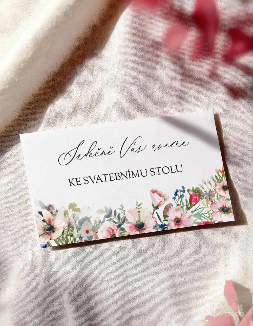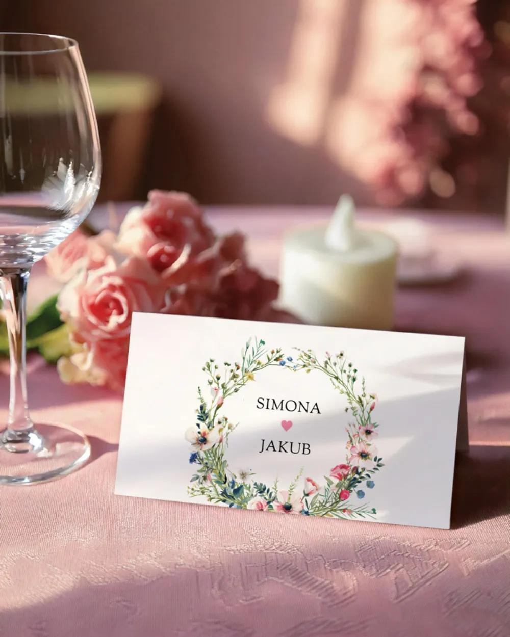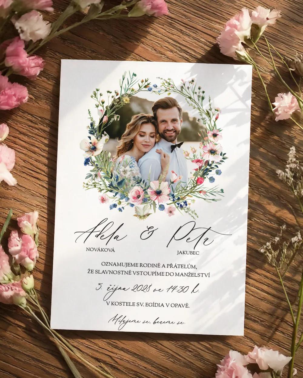 Svatební oznámení v jemném a romantickém stylu s květinovým věncem z lučních květů v pastelových tónech růžové, modré a krémové. Elegantní kombinace moderního sefirového písma a jemných ručně psaných detailů dodává oznámení vytříbený vzhled. Toto provedení je ideální volbou pro páry, které upřednostňují svěží, přírodní estetiku a svatbu v boho nebo rustikálním stylu. Ve stejném vizuálním stylu jsou k dispozici také další svatební tiskoviny jako jmenovky, menu, etikety, pozvánky ke stolu či samolepky.