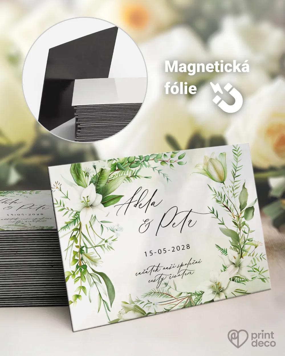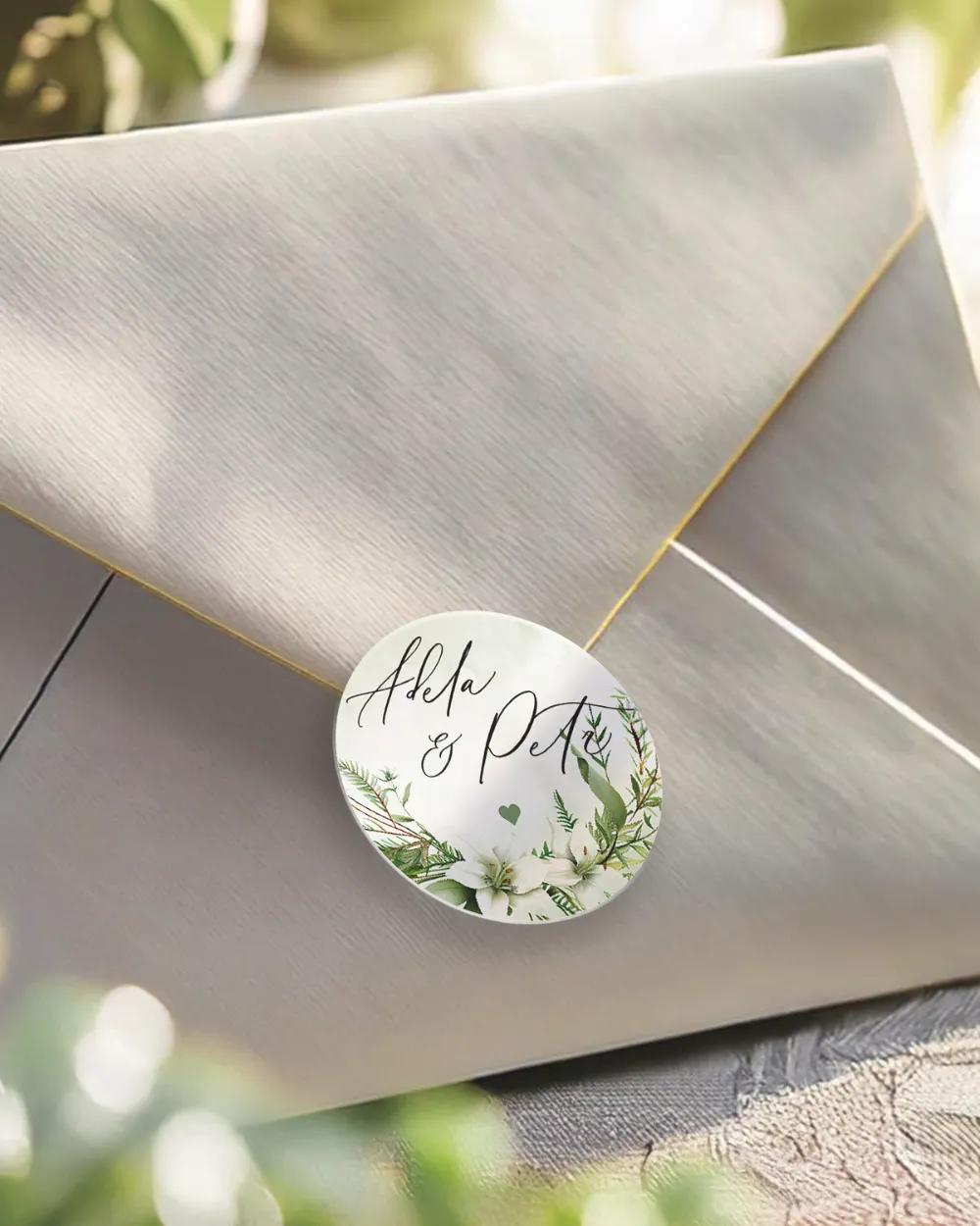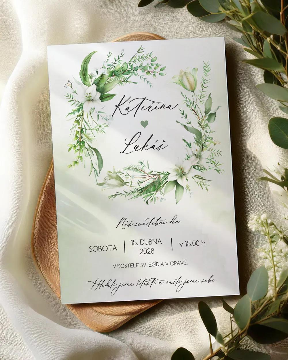 Svatební oznámení s možností vložení vlastní fotografie je zdobeno elegantním květinovým věncem v přírodních zelených tónech s bílými liliemi. Jemné akvarelové pozadí dodává celkovému vzhledu romantiku a vytříbenost, zatímco kombinace ručně psaného a moderního písma podtrhuje jeho nadčasový charakter. Tento styl je ideální pro svatby v přírodním, minimalistickém nebo elegantním duchu a nabízí nádherný způsob, jak oznámit svůj velký den s osobním dotekem. Ve stejném stylu jsou dostupné také svatební tiskoviny jako jmenovky, menu, etikety, pozvánky ke stolu, samolepky a mnoho dalšího.