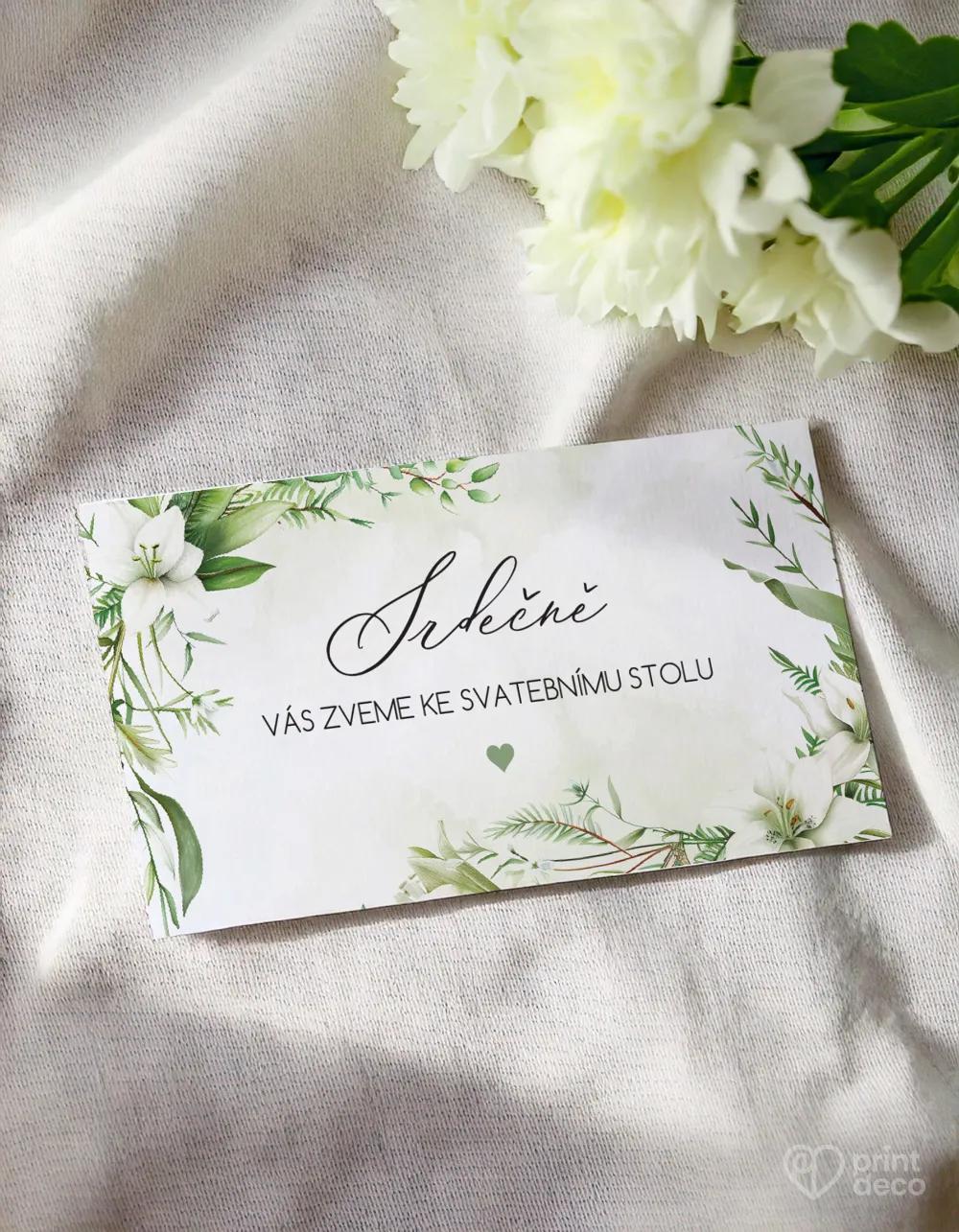 Svatební oznámení s fotkou Liliový slib I v přírodních zelených tónech s bílými liliemi a jemným akvarelovým pozadím. Nadčasový, elegantní design s osobním dotykem.