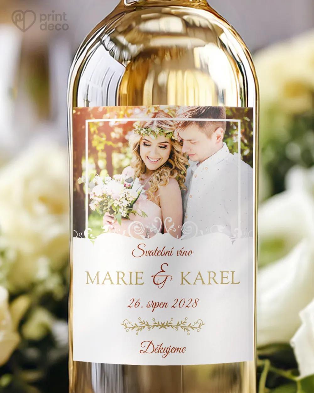 Svatební fotooznámení Čaro okamihu v elegantním stylu, s jemnými ornamenty a možností vložit vlastní fotografii.