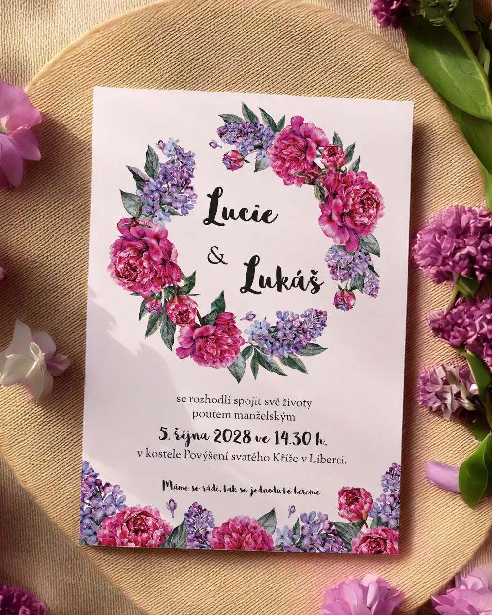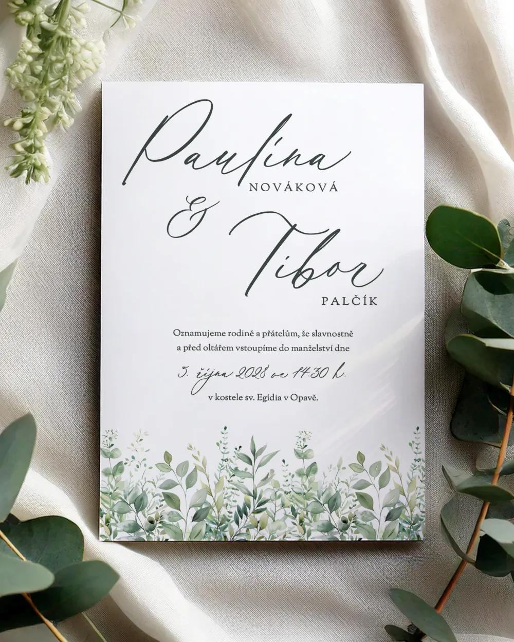 Motiv můžete sladit i s dalšími svatebními tiskovinami ve stejném stylu – jmenovkami na stůl, etiketami na lahve pro výslužku, magnetkami či děkovnými kartičkami, aby vše působilo harmonicky a jednotně.