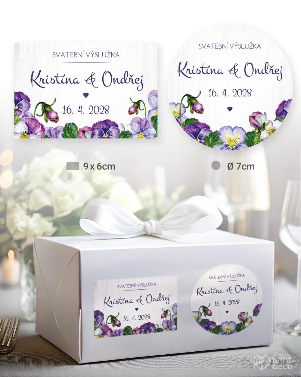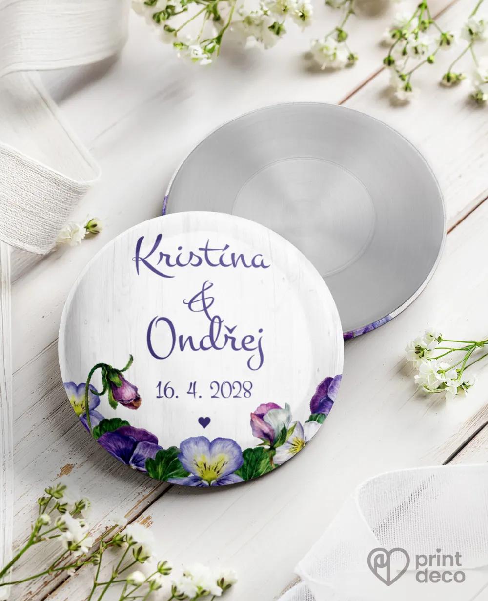 Kulaté svatební zrcátko s jemným motivem fialek jako romantická vzpomínka pro hosty. Úprava zdarma a decentní květinový detail vašeho svatebního dne.