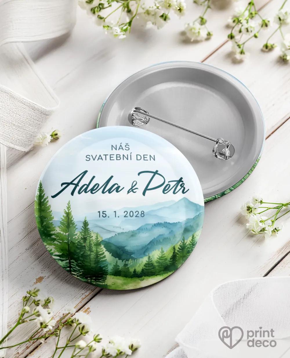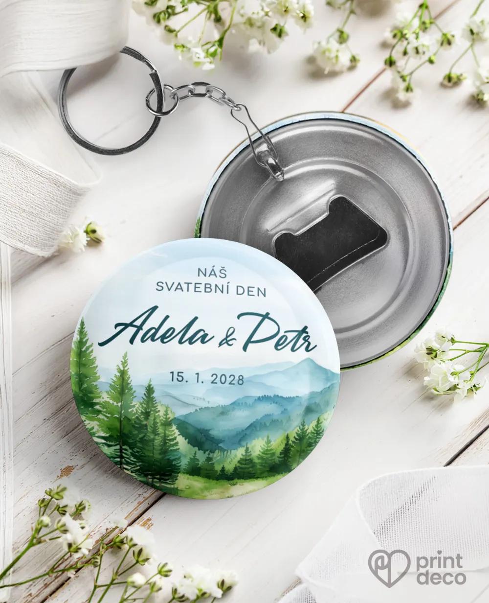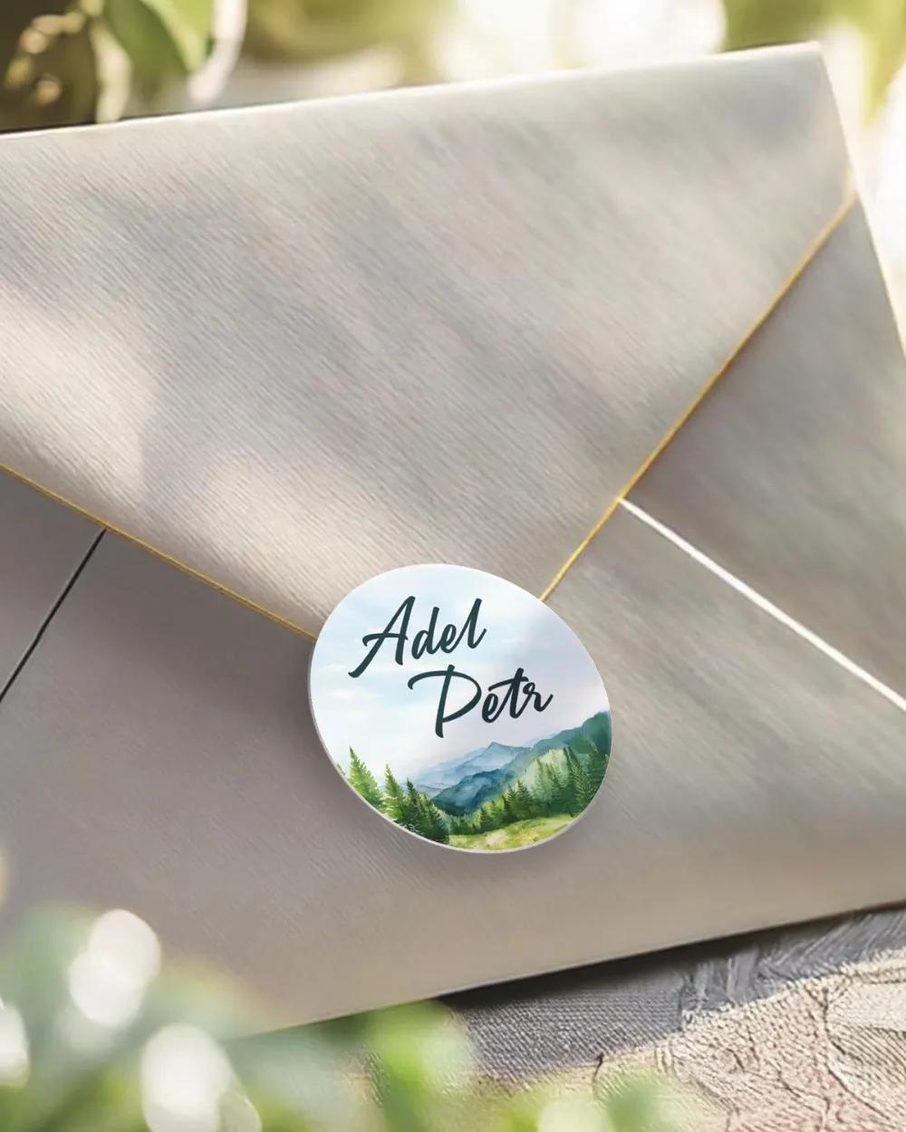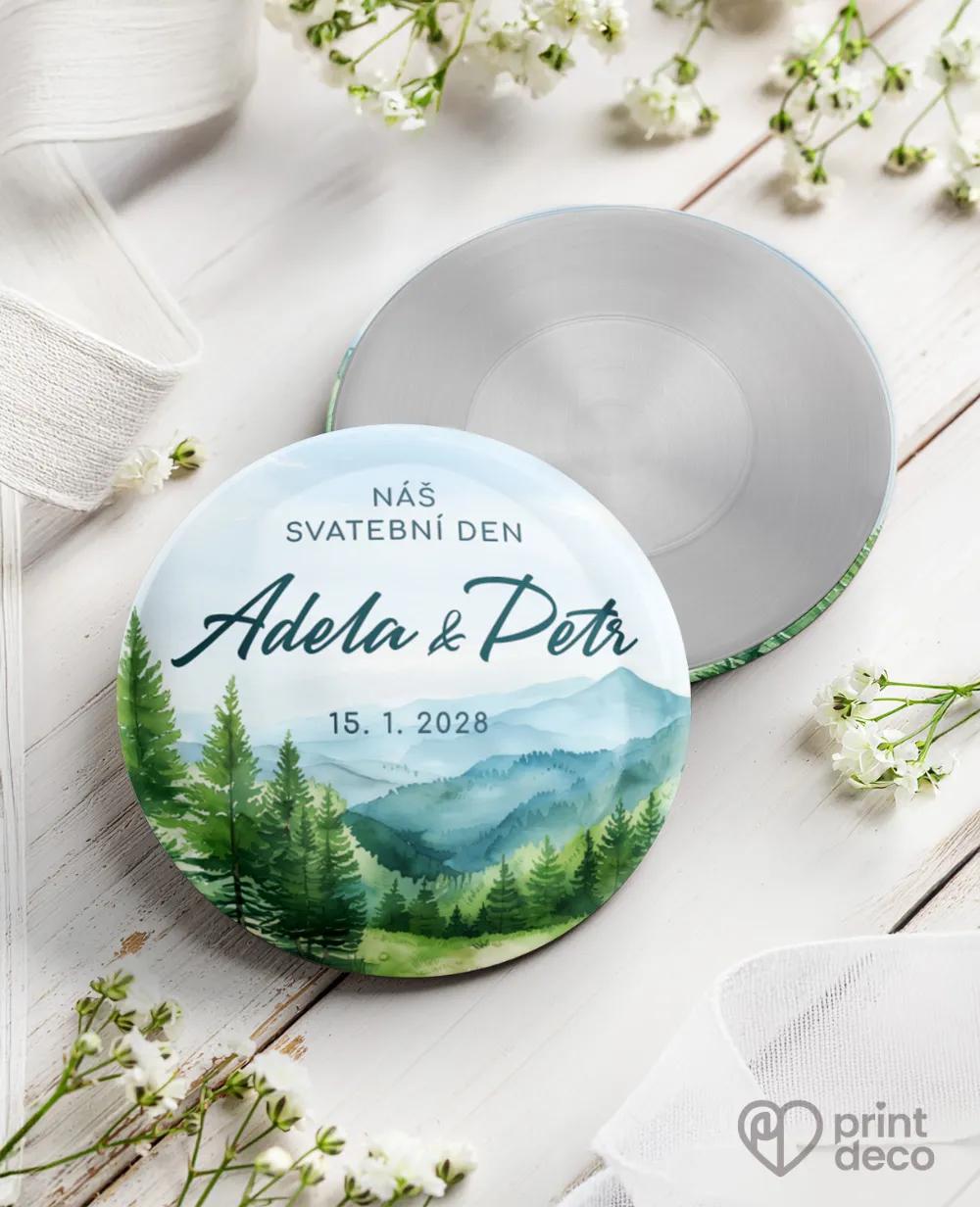 Originální kulaté svatební zrcátko s jemně malovaným motivem zelených hor a lesů vnese do vaší svatby nádech přírody. Tento stylový doplněk je krásnou památkou a praktickým dárkem pro hosty, kteří ocení osobní dotek. Díky personalizaci jmény snoubenců a datem svatby působí zrcátko jedinečně a bude hostům dlouho připomínat váš den. Kovový základ a kvalitní tisk zajišťují odolnost a estetický vzhled. Styl lze sladit i s dalšími tiskovinami – etiketami na víno, jmenovkami nebo menu – pro dokonalý vizuální soulad.