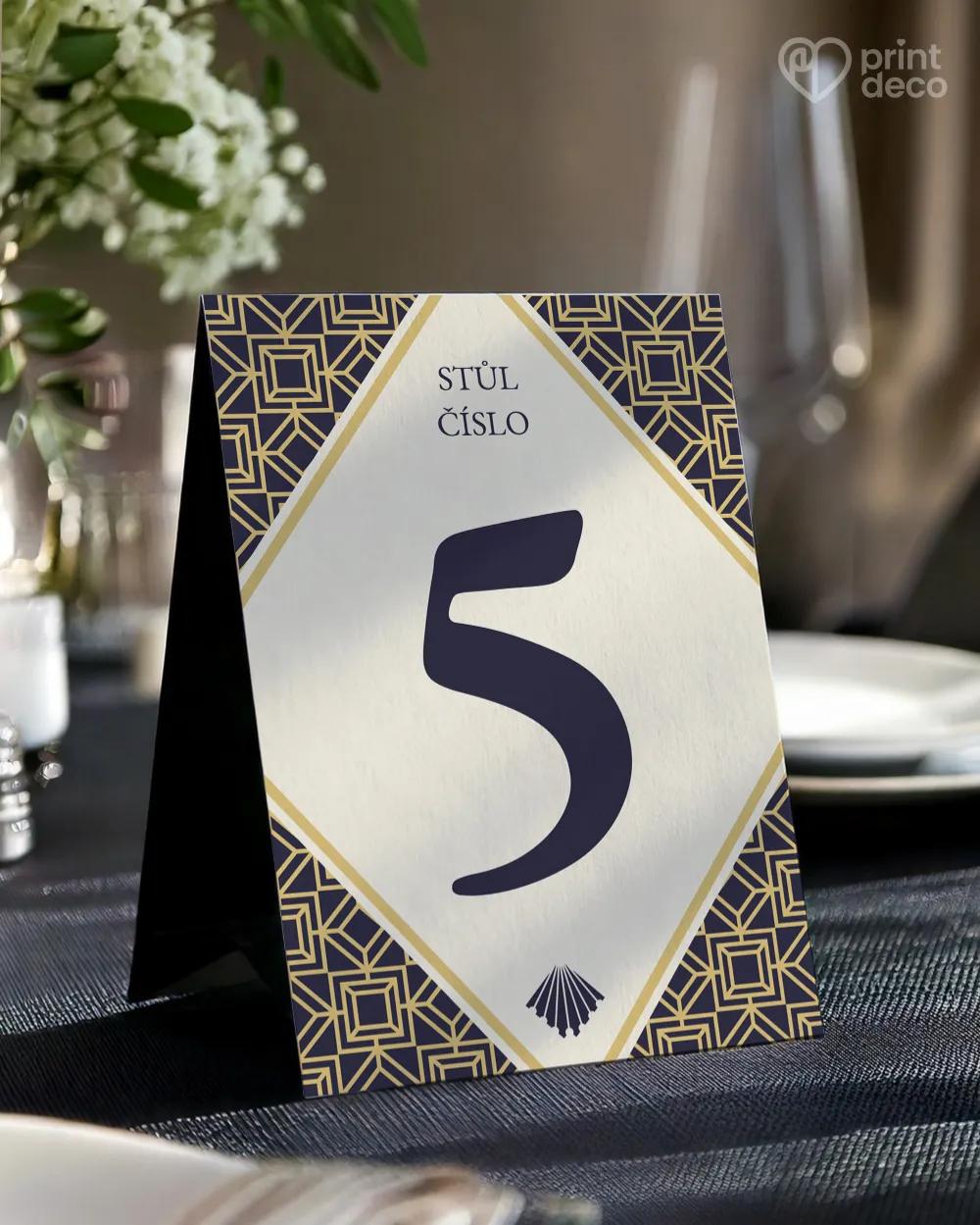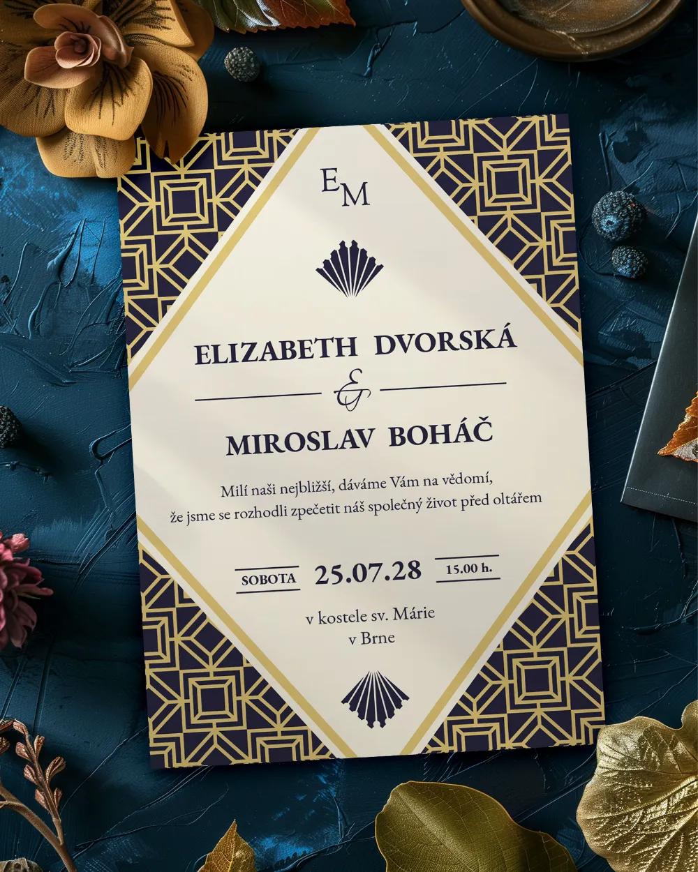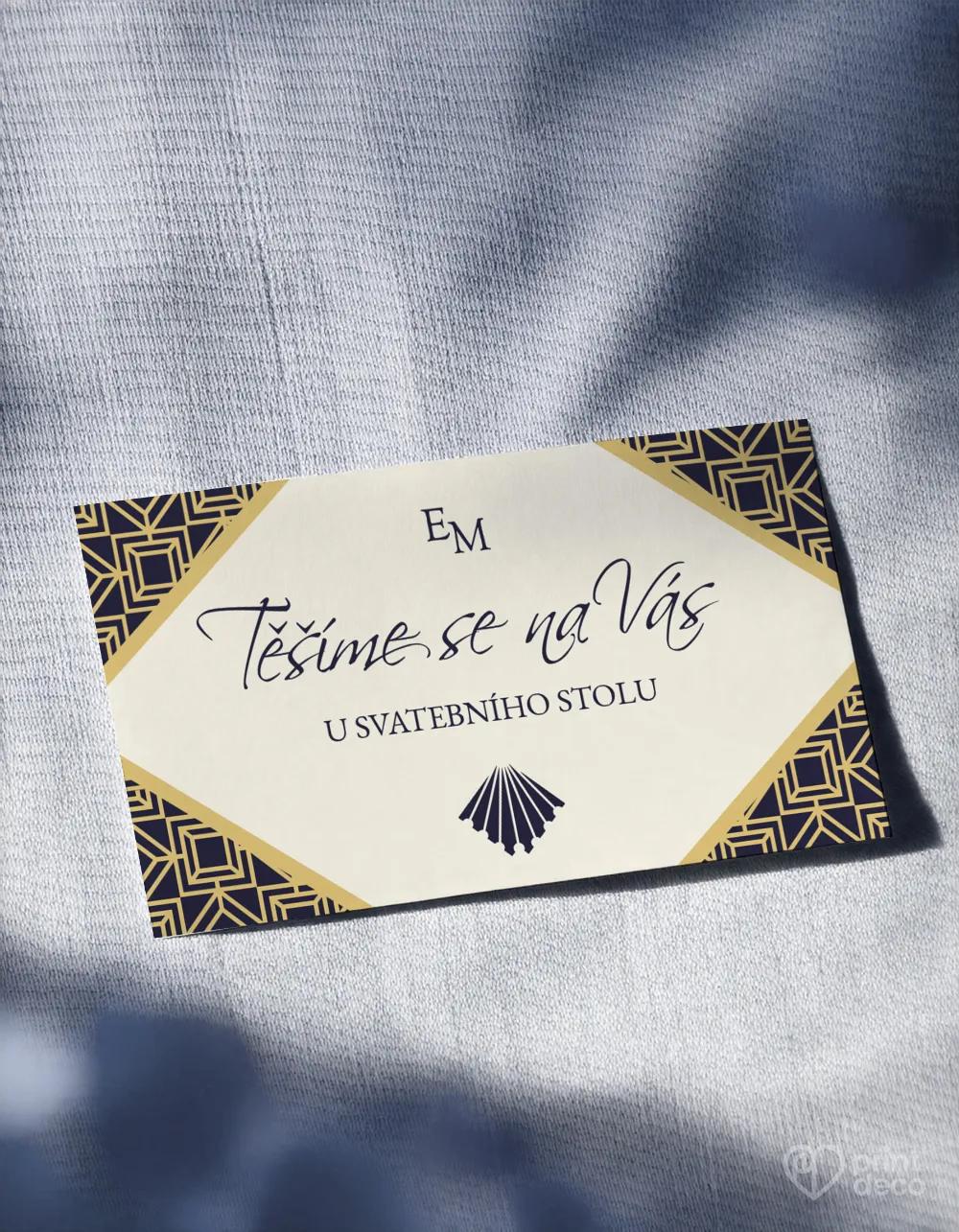 Svatební vložka do obálky v art deco stylu s geometrickými vzory ve zlaté a tmavě modré dodá oznámením luxusní, noblesní a nadčasový vzhled.