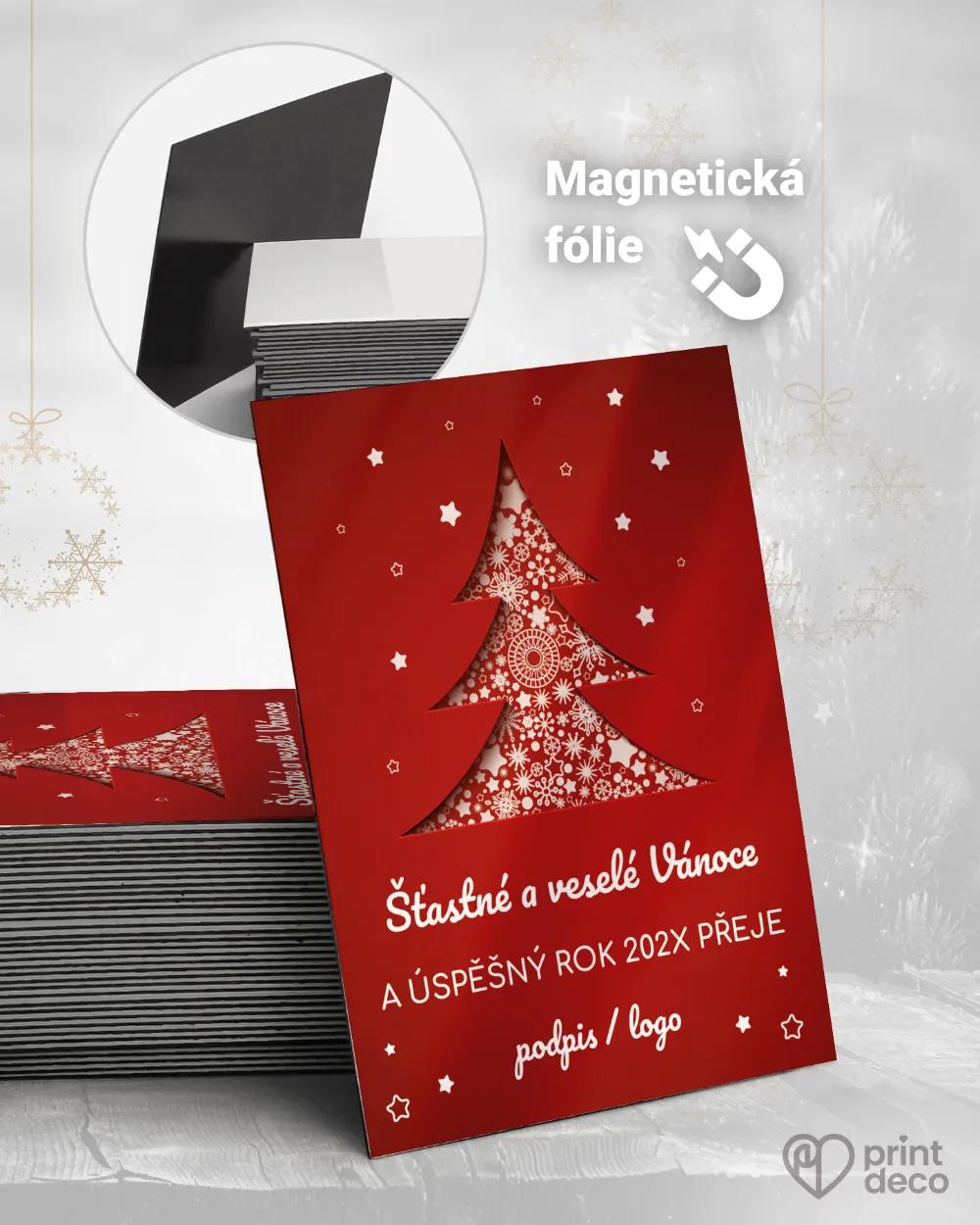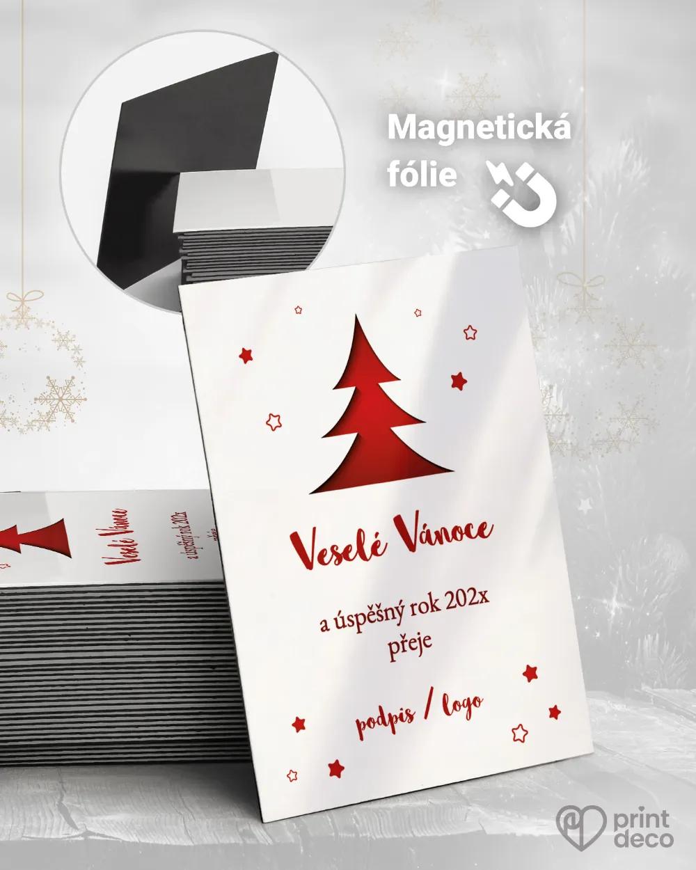 Vánoční pozdrav červený stromek vyniká moderním a elegantním vzhledem. Výrazná červená barva symbolizuje sváteční teplo a energii, zatímco jemný vzor bílých vloček dodává detail a něžnost. Design působí reprezentativně, vhodný je pro firemní i osobní přání. Lze doplnit logo, podpis či vlastní text – úprava zdarma v online editoru. Kvalitní tisk a expresní výroba zaručují precizní zpracování, díky němuž se pozdrav stane elegantním vyjádřením vánoční radosti.
