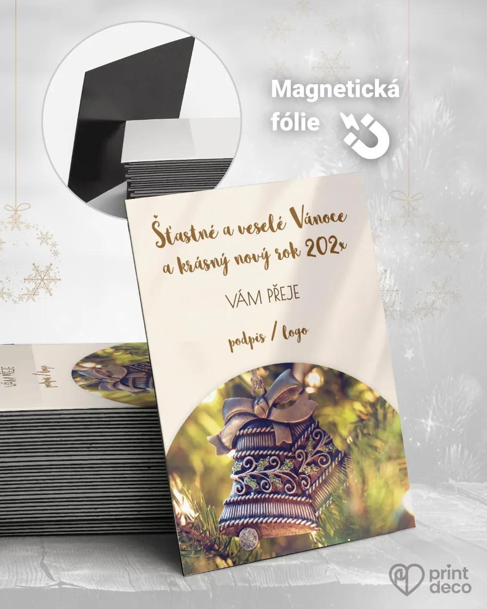 Elegantní vánoční pozdrav se zlatavým zvonkem a jemným svátečním rámováním. Vhodný pro firmy i jednotlivce. Kvalitní tisk, expresní výroba a úprava zdarma v online editoru.