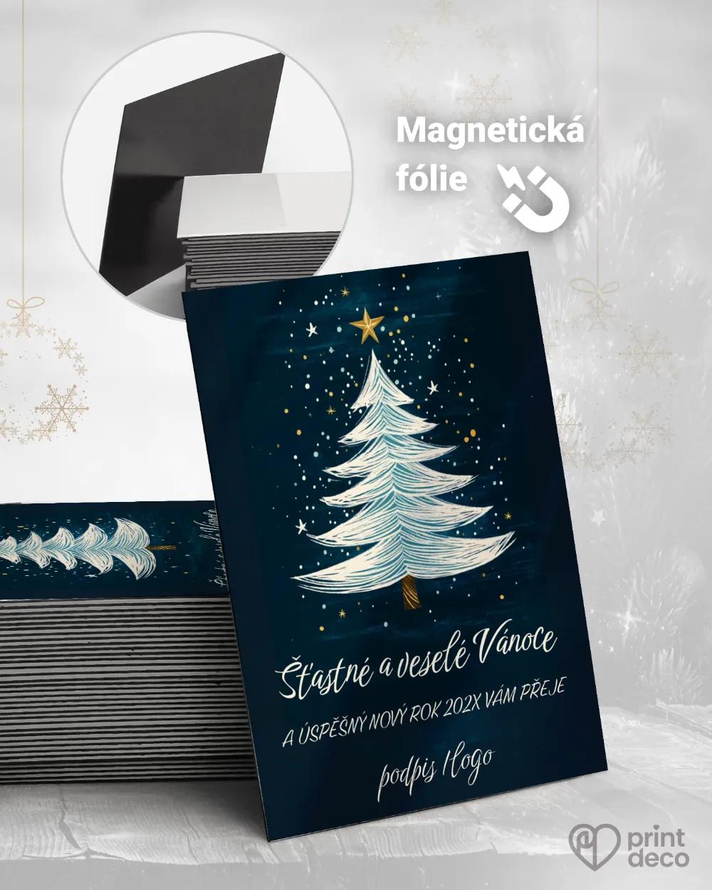 Elegantní oboustranné vánoční přání v tmavě modrém provedení s bílým stromkem a zlatými akcenty vytváří seriózní a zároveň sváteční dojem. Je ideální jako přání pro finanční instituce, banky, pojišťovny nebo obchodní společnosti, které chtějí svým klientům poděkovat profesionálním způsobem. Díky úpravě zdarma přes online editor lze snadno doplnit logo, text či podpis. Kvalitní tisk, expresní výroba a decentní design zaručují reprezentativní výsledek a sváteční eleganci.