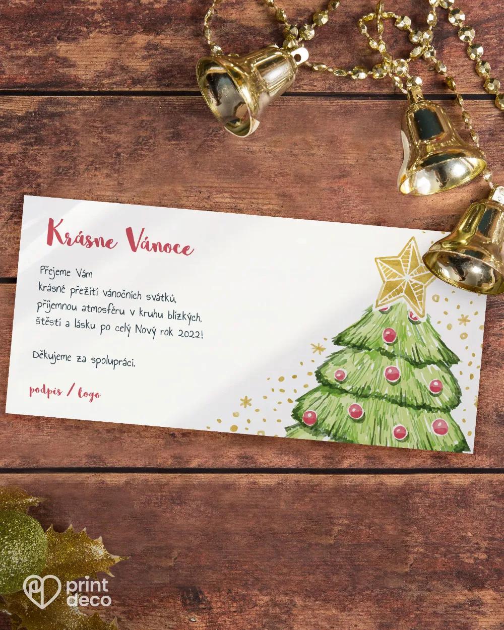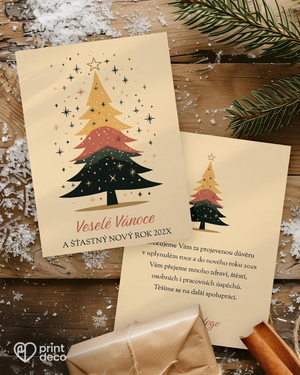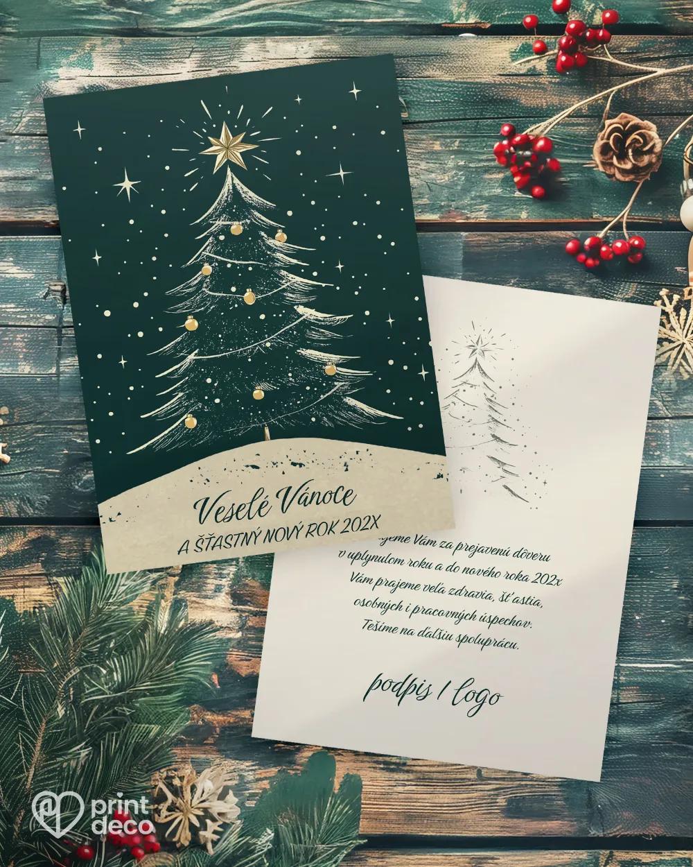 Oboustranné vánoční přání s motivem modrého lesa, vhodné pro ekologické firmy, wellness centra a cestovní ruch. Personalizace zdarma.