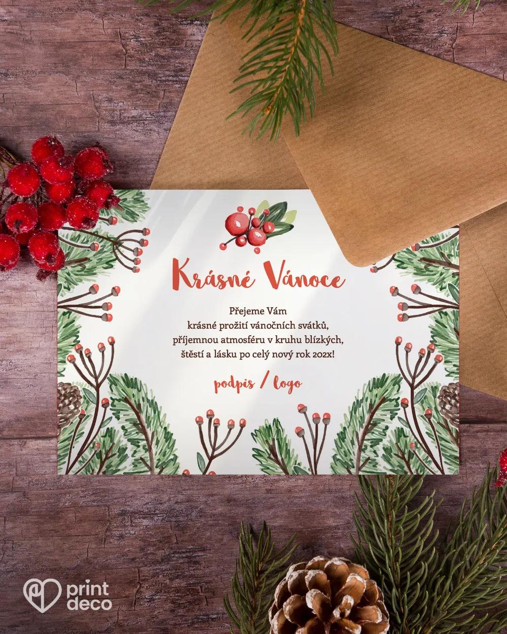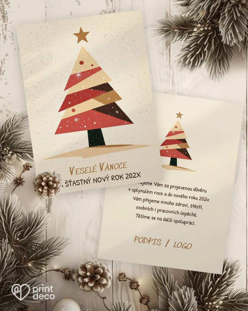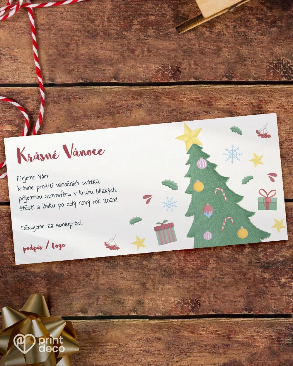 Oboustranné vánoční přání s osvětleným stromem v zimní krajině, vhodné pro školy a úřady.