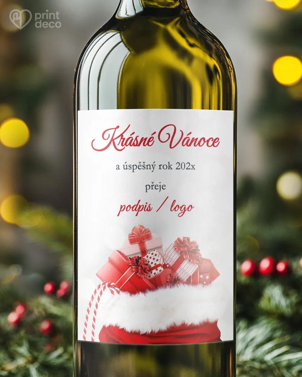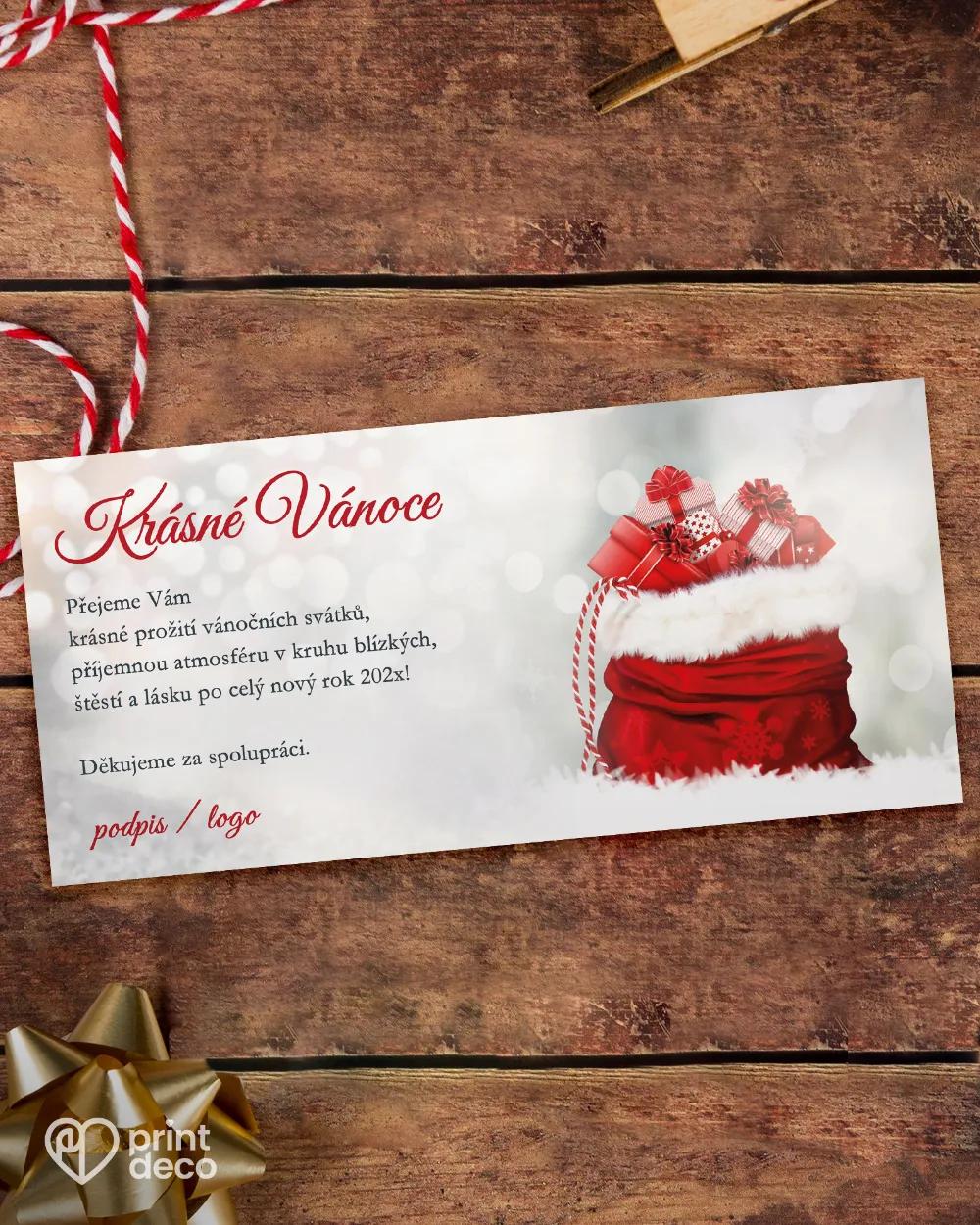 Elegantní vánoční magnetky s motivem červených dárků v mikulášském pytli. Personalizace logem či textem, úprava zdarma přes online editor, expresní výroba.