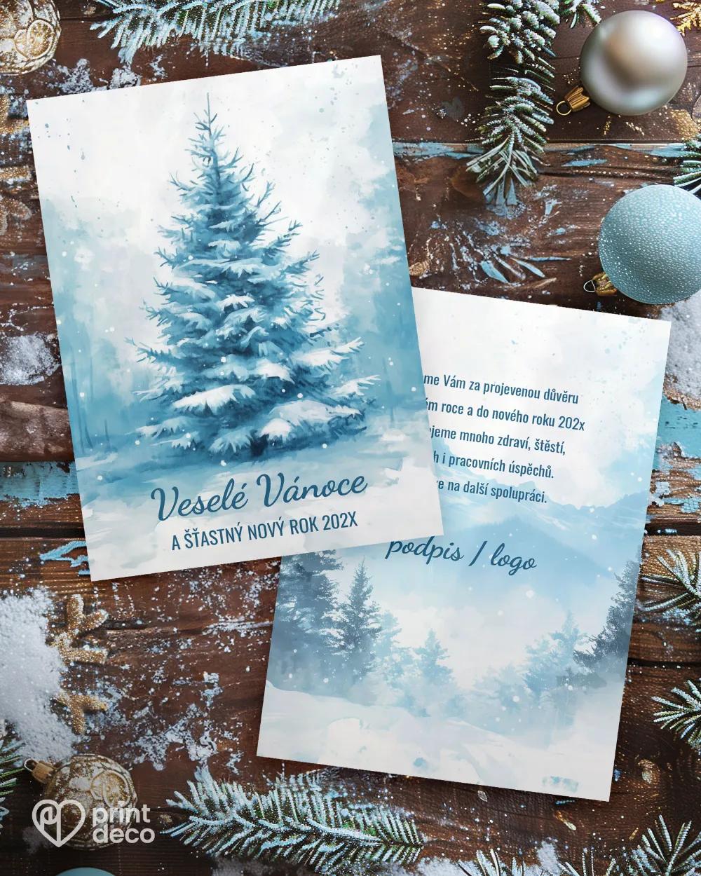 Vánoční magnetky se zasněženým stromečkem v modrém tónu působí elegantně a svěže. Úprava zdarma v online editoru, expresní výroba, praktický reklamní předmět.