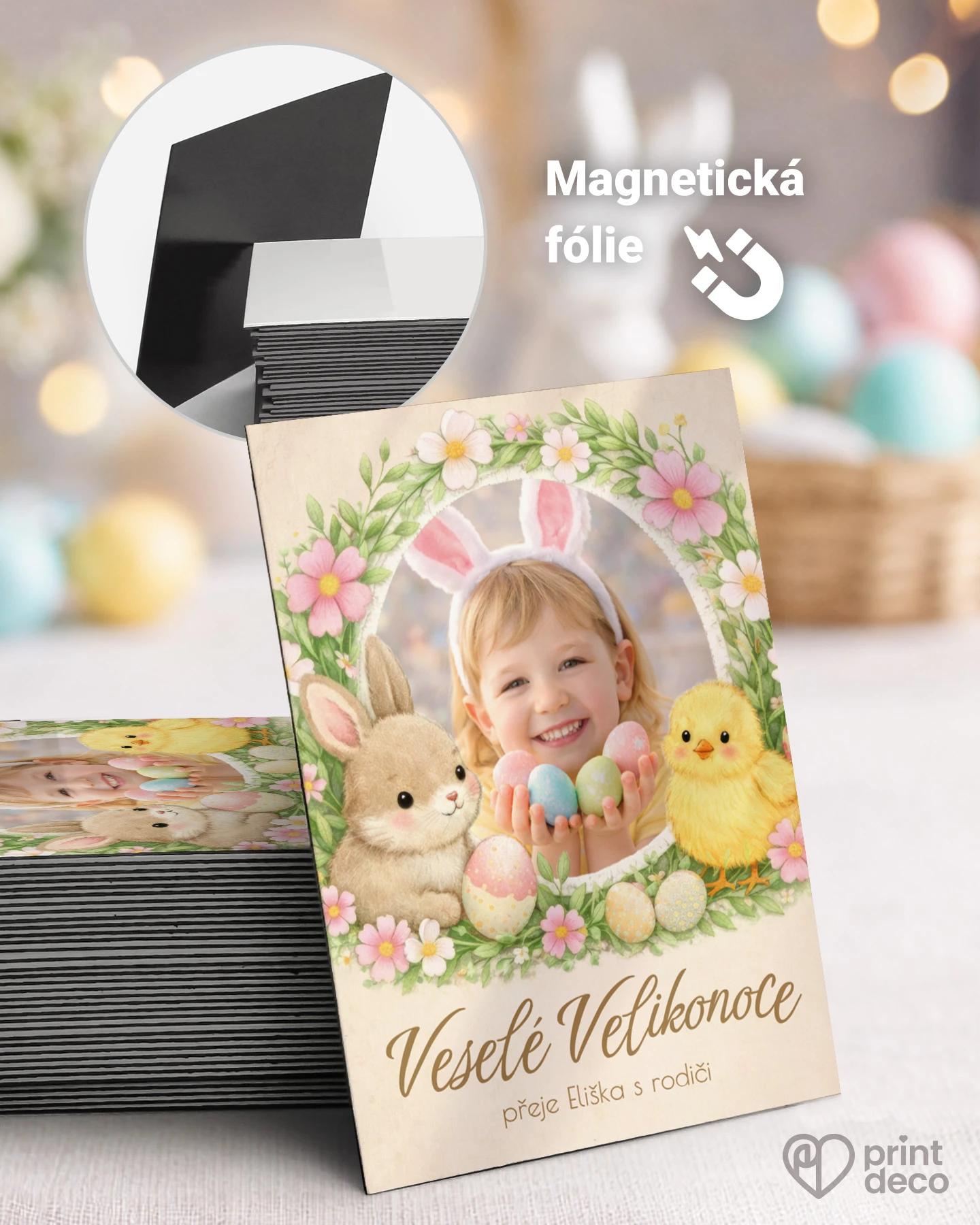Velikonoční foto magnetka s jemným jarním motivem košíku plného kraslic a květin přináší veselou sváteční atmosféru a umožňuje proměnit vlastní fotografii v originální rodinnou vzpomínku. Přední stranu si jednoduše přizpůsobíte vlastní fotografií, která může zachytit společné rodinné chvíle, děti nebo velikonoční momenty, a doplníte vlastní přání či jména. Magnetka se stane milým velikonočním pozdravem i pěknou dekorací na lednici či magnetickou tabuli, která bude připomínat sváteční chvíle po celý rok. Díky úpravě zdarma přes online editor, kvalitnímu tisku a expresní výrobě získáte velikonoční foto magnetku s osobním a srdečným charakterem.